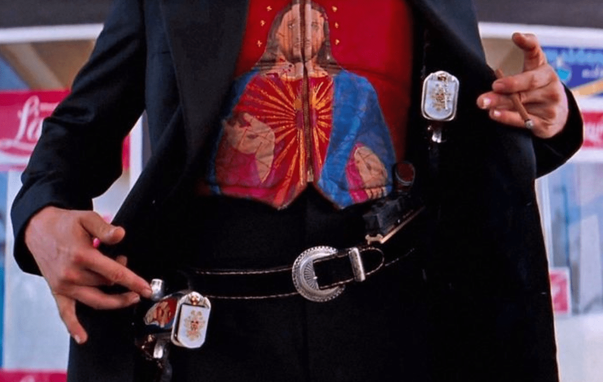 I think everyone who has seen Baz Luhrmann’s Romeo + Juliet can recall when and where they were when first experiencing Leonardo DiCaprio’s Romeo appear out of the simmering heat, smoking, writing and wearing a dishevelled tuxedo. He goes on to wear loose patterned shirts, unbuttoned to the midriff in the general style of the Miami-inflected Verona Beach, a play on the original setting of Verona, Italy. Catholic imagery is abound in this violent, sweaty setting. Who could forget Tybalt’s Jesus waistcoat?