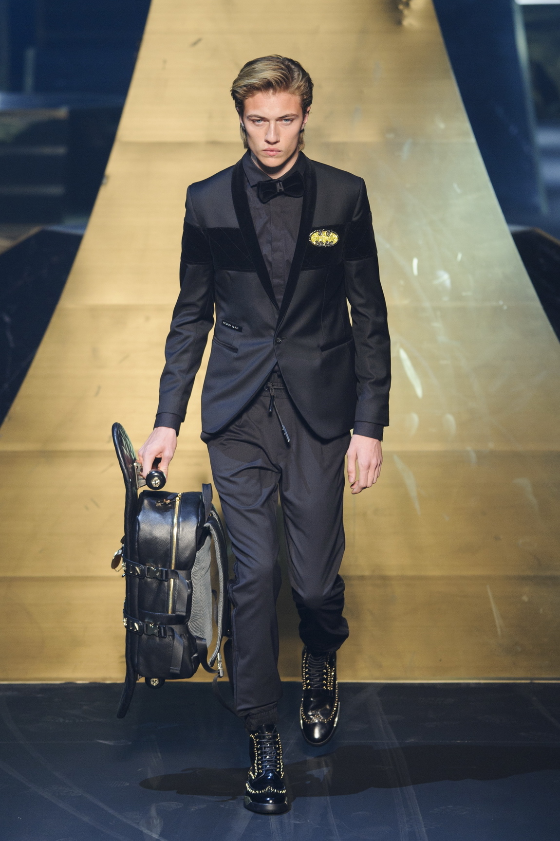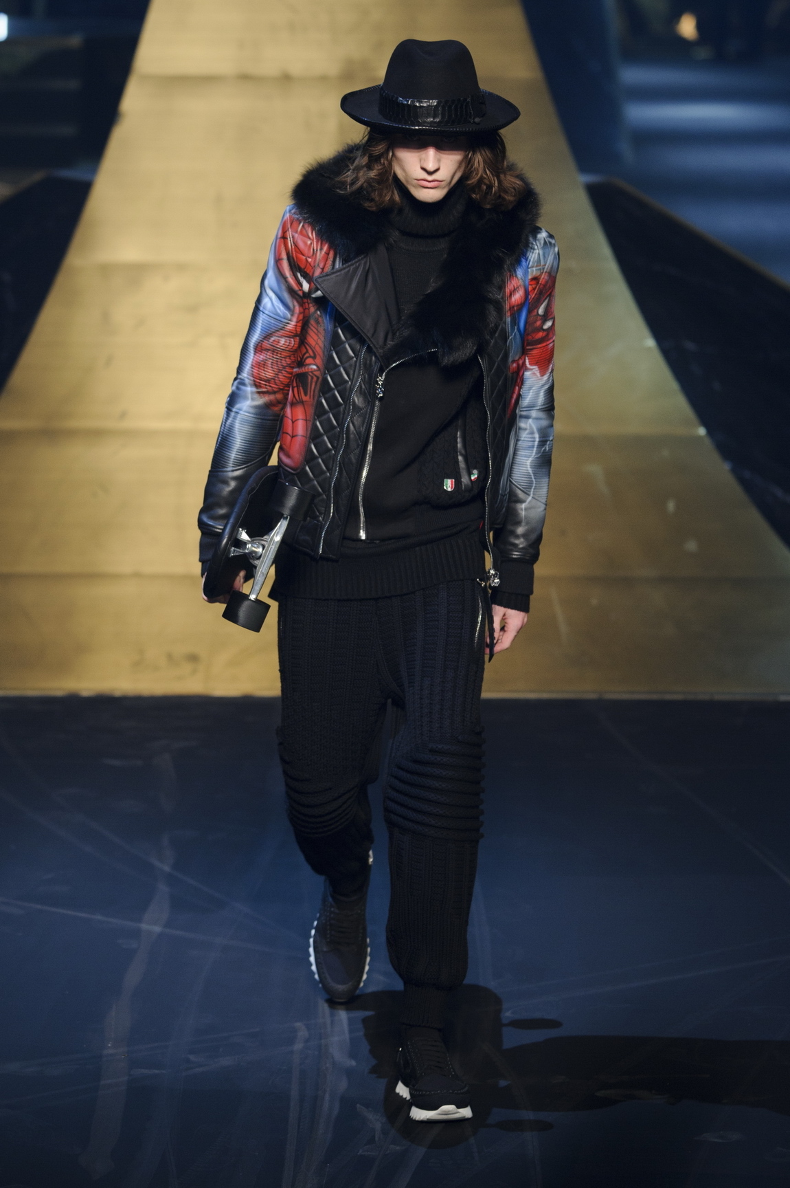 Dubbed #PLEINHERO, the collection nods to Batman and Superman with their symbols emblazoned in gold across sweaters and likenesses spray painted onto leather jackets. The models were strapped into “cross-bred sneaker/brogues” that have custom-made air-filled soles “allowing them to fly off like modern day super men”. Sounds pretty super to us!