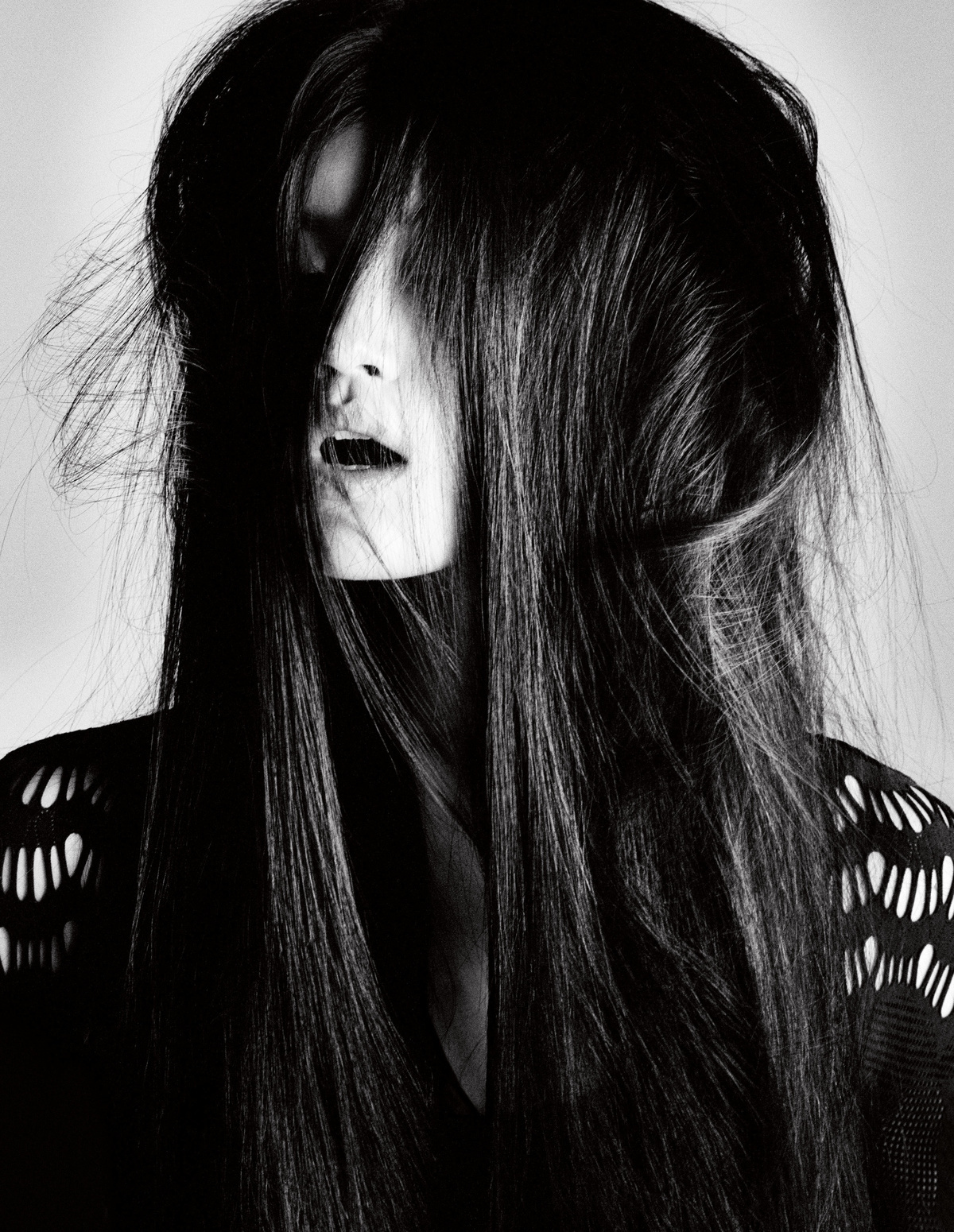 Lara Stone wears John FriedaLuxurious Volume Thickening Blow Dry Lotion. Body stocking Leg Avenue.
