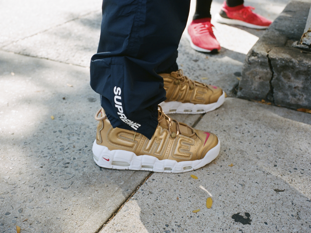 From head to toe, what are you wearing? Supreme tee, vintage Nike pants, and Air Max 97 silver bullets.