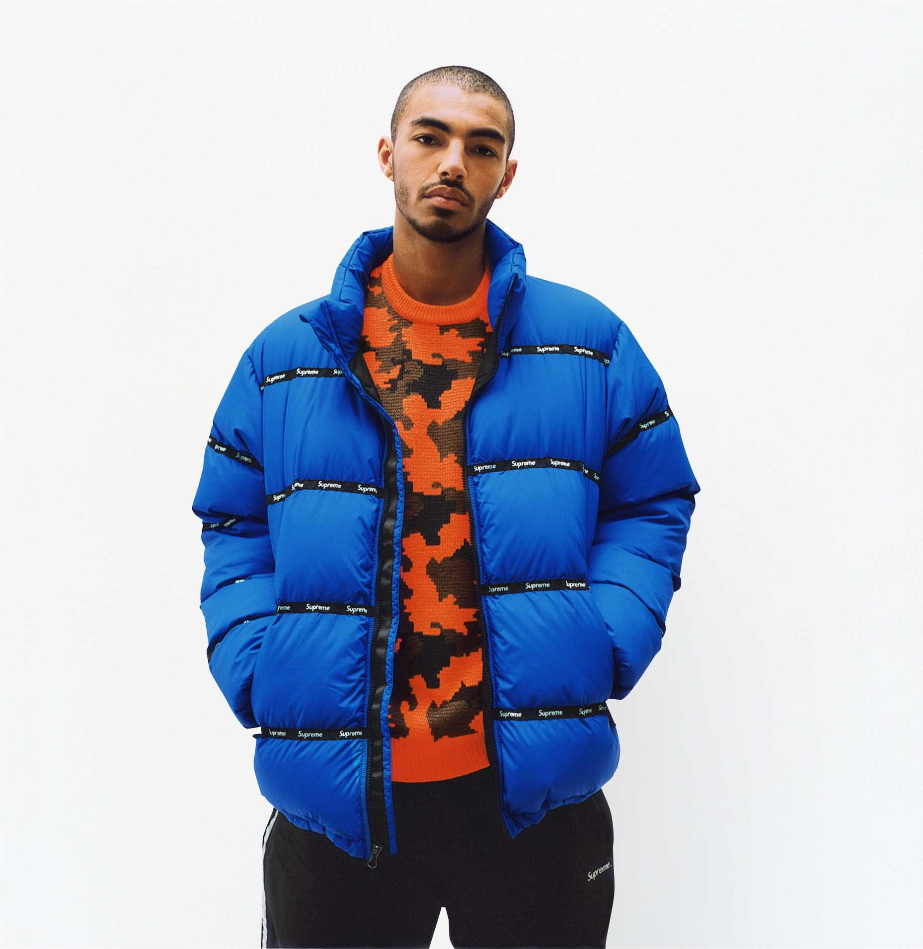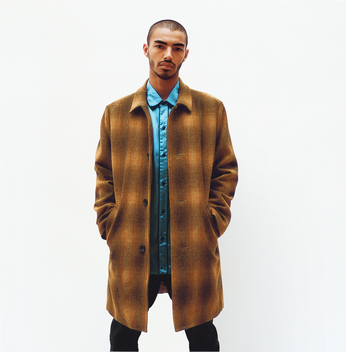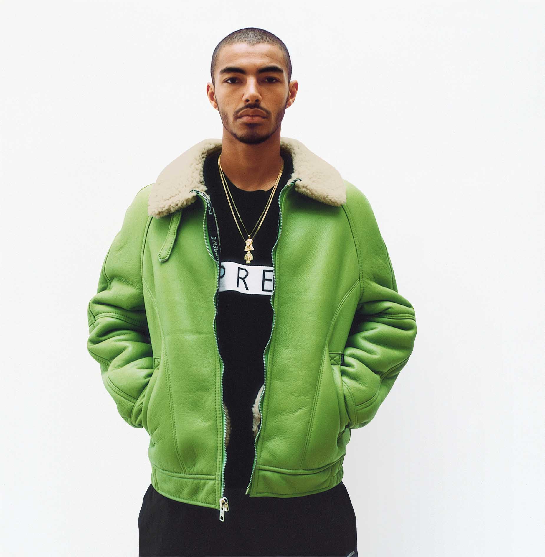 The full fall/winter 16 collection also includes colorful array of winter jackets, including a lime green leather bomber with a fluffy collar, a blue puffer with logo piping, a brown check car coat, logo parkas, and more — all modeled by Supreme skater Sage Elsesser.