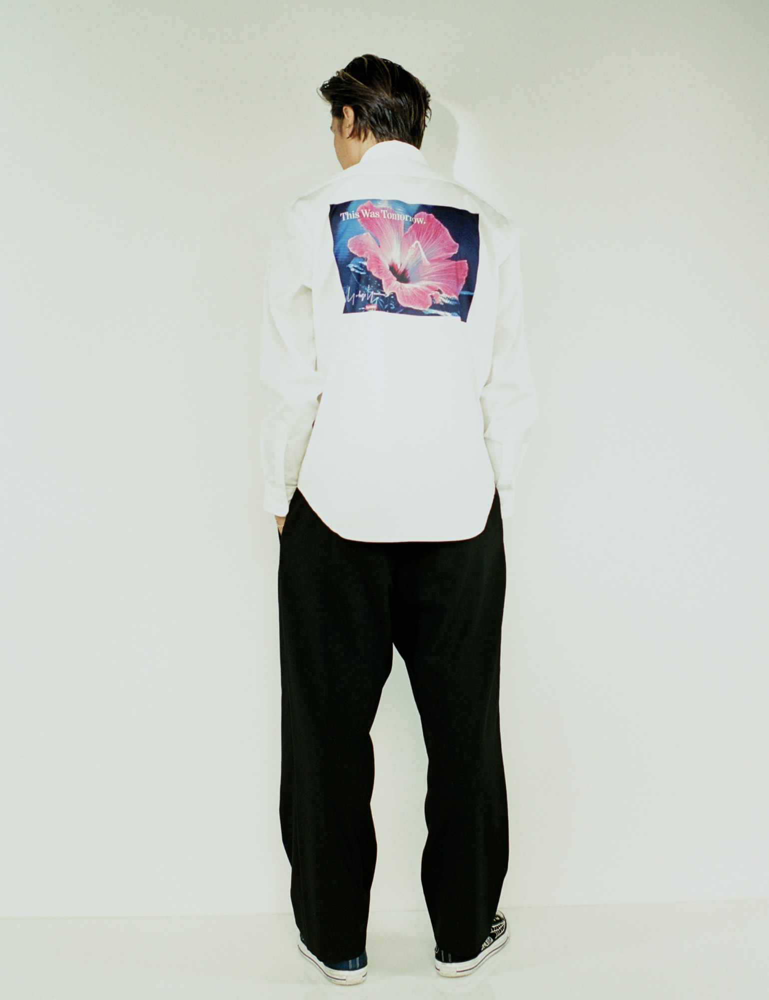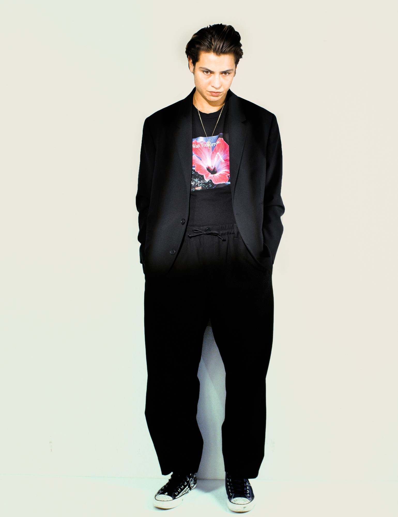 It’s exactly that signature that he’s brought to his collaboration with Supreme, issuing a unisex capsule of clothes that cast the vision he’s refined over four decades in the business in a fresh new light. An oversized black wool suit with drawstring trousers harmonises the Japanese designer’s pattern-cutting maitrise with the at-ease air of Supreme. And then there’s the referencing of Yohji’s use of faintly haunting graphics across his body of work, translating to a squiggled face airbrushed on the back of a leather jacket, or a flower rendered in 8-bit on a knit pullover.