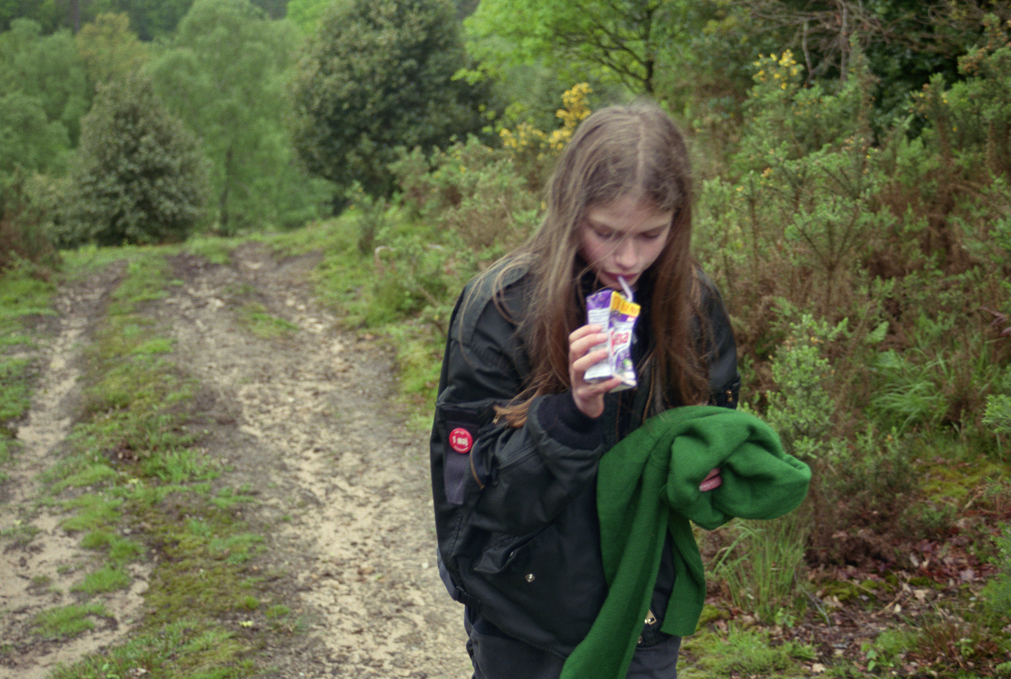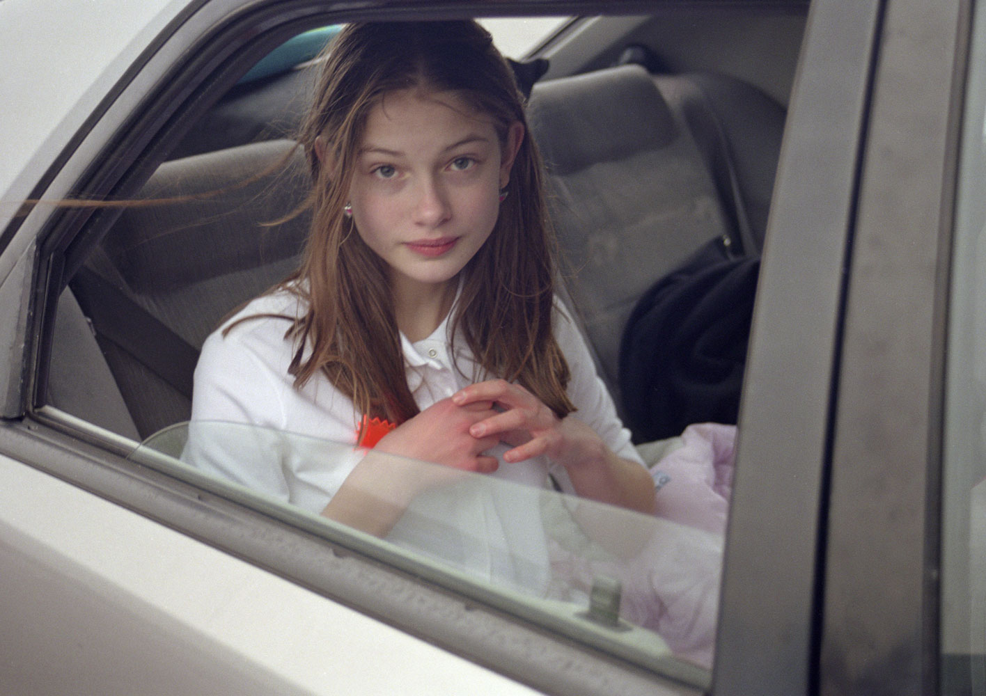 This sense of natural ease is felt throughout the jumbled years and pages of the book, which are purposefully not arranged in chronological order. Shot in Angela’s strikingly simple style, they capture Sylvia just as she is — traipsing through the woods with camping gear, wrapping herself in towels in her bathroom, slurping down juice boxes, and peering down trees mid-climb. Alongside snapshots of domestic stillness and natural beauty, the book also features recurring scenes of Sylvia travelling in the backseat of a car, evoking the childhood sensation of being on long family drives, gazing out the window and daydreaming of alternate realities.