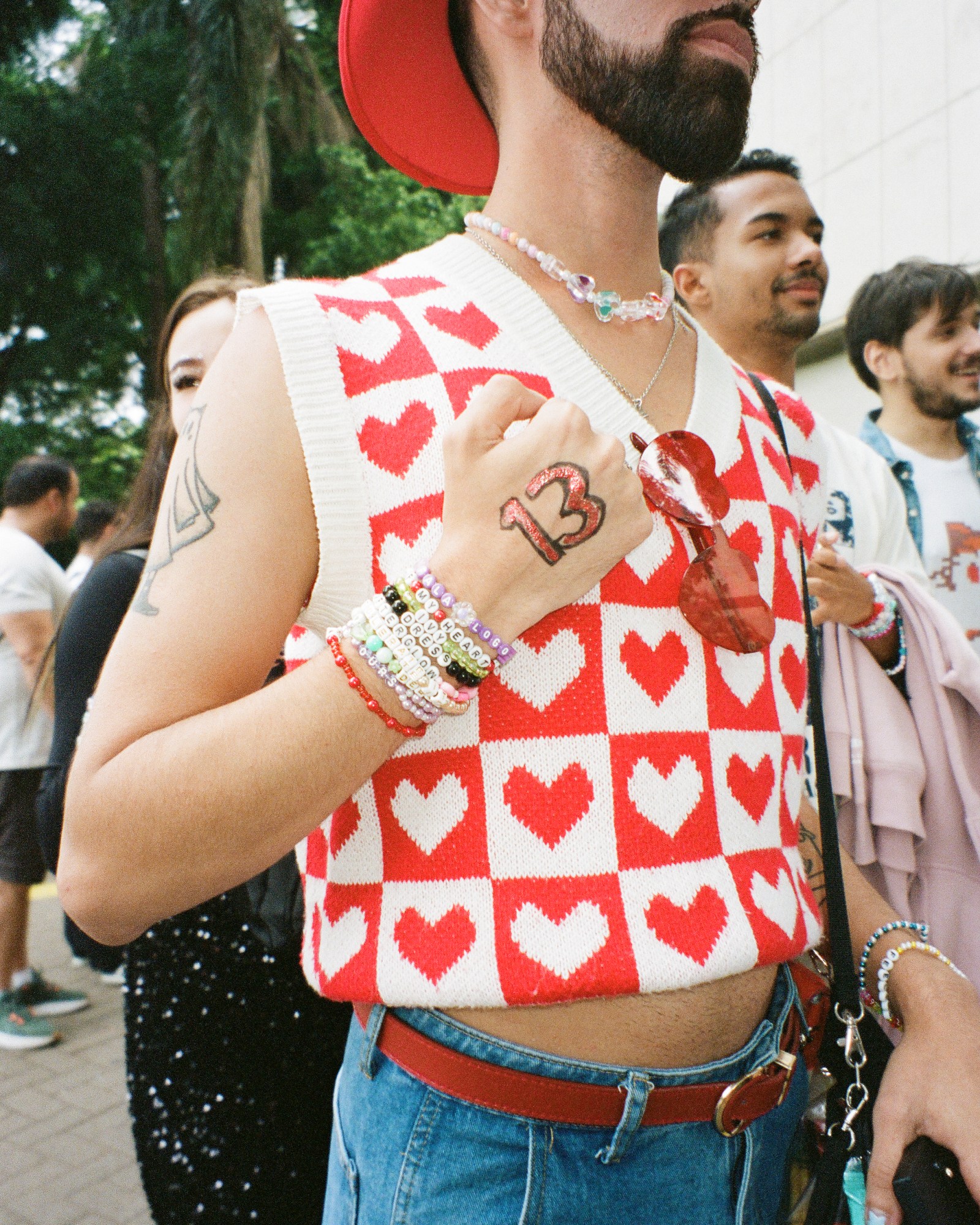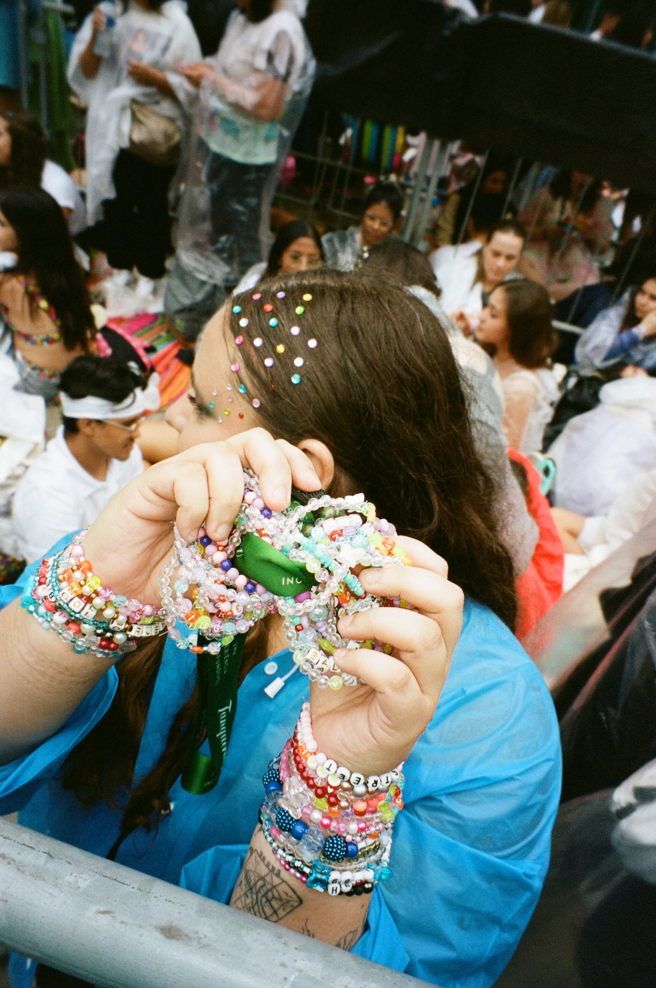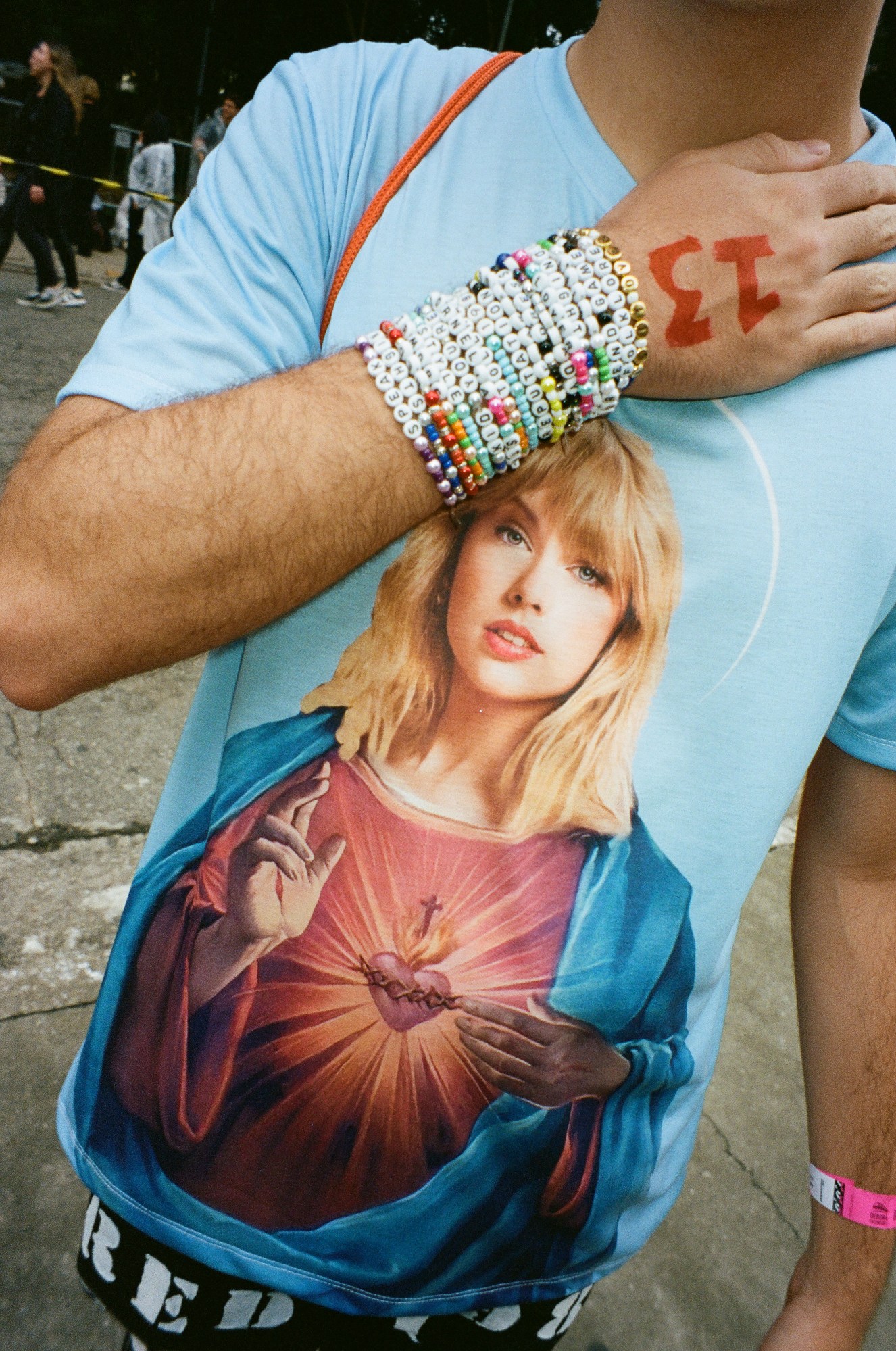 Photograph by Pedro Pinho of Taylor Swift fan wearing bead lyric bracelets at the Eras Tour in Brazil