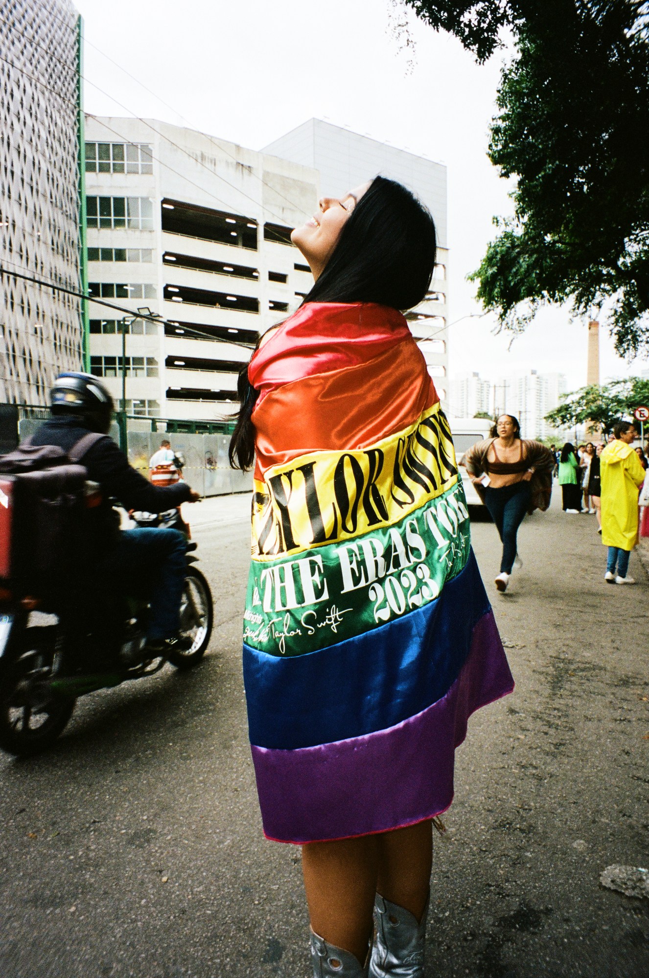 Photograph by Pedro Pinho of a Taylor Swift fan wearing a Pride flag at the Eras Tour in Brazil