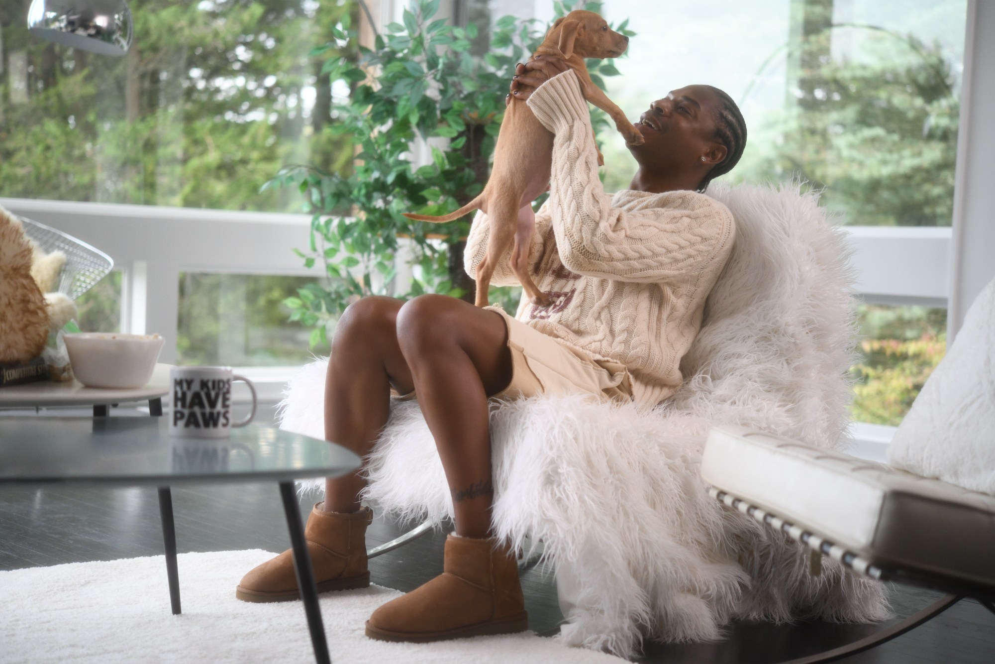 A hint towards the collab was first given last night when the New York-based designer posted a clip of himself in a black tee, with a mashup of his ‘TC’ logo and UGG spangled across its chest in glittering rhinestones. Today, UGG has followed up with what they call “a cross between ‘a day in the life’ bio-short and an ASMR video”, showing the designer doing the sort of plush, cosy things lockdown dreams are made of: whipping up pancakes; drawing in the garden; playing with a puppy — things that UGGs are the only appropriate footwear for.