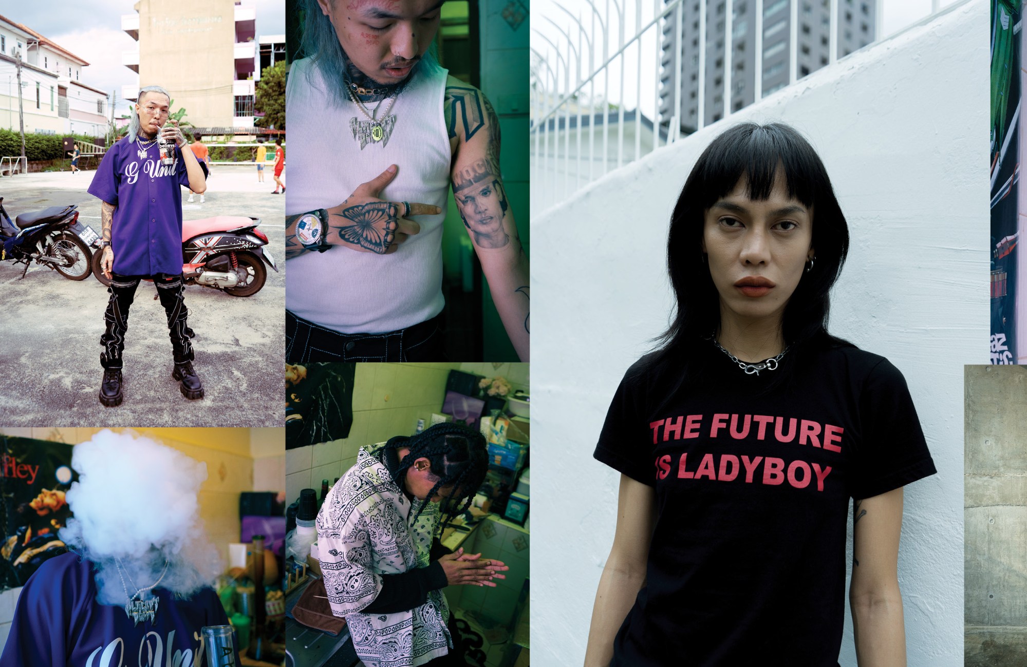On top of playing a pivotal role in the city’s underground music scene, Nalin is also a model and runs an Instagram street casting account where she celebrates people who may not adhere to mainstream Thai beauty standards, which align with wider Asian beauty standards of being skinny and having lighter skin. She has also been paving the way for many of the younger generation of trans kids in Thailand who may feel like the society puts them in a box or tries to tell them what they can or can’t be. “I think everyone is beautiful in their own way, even if they don’t fit in with society’s expectations of beauty,” Nalin says. She is also the brain behind a series of viral T-shirts bearing the slogan: The Future is Ladyboy. “I wanted to reclaim this word, get rid of the stigma around it, and make it fashionable,” she explains. “Yes, I’m a ladyboy, and I’m proud, thank you.”