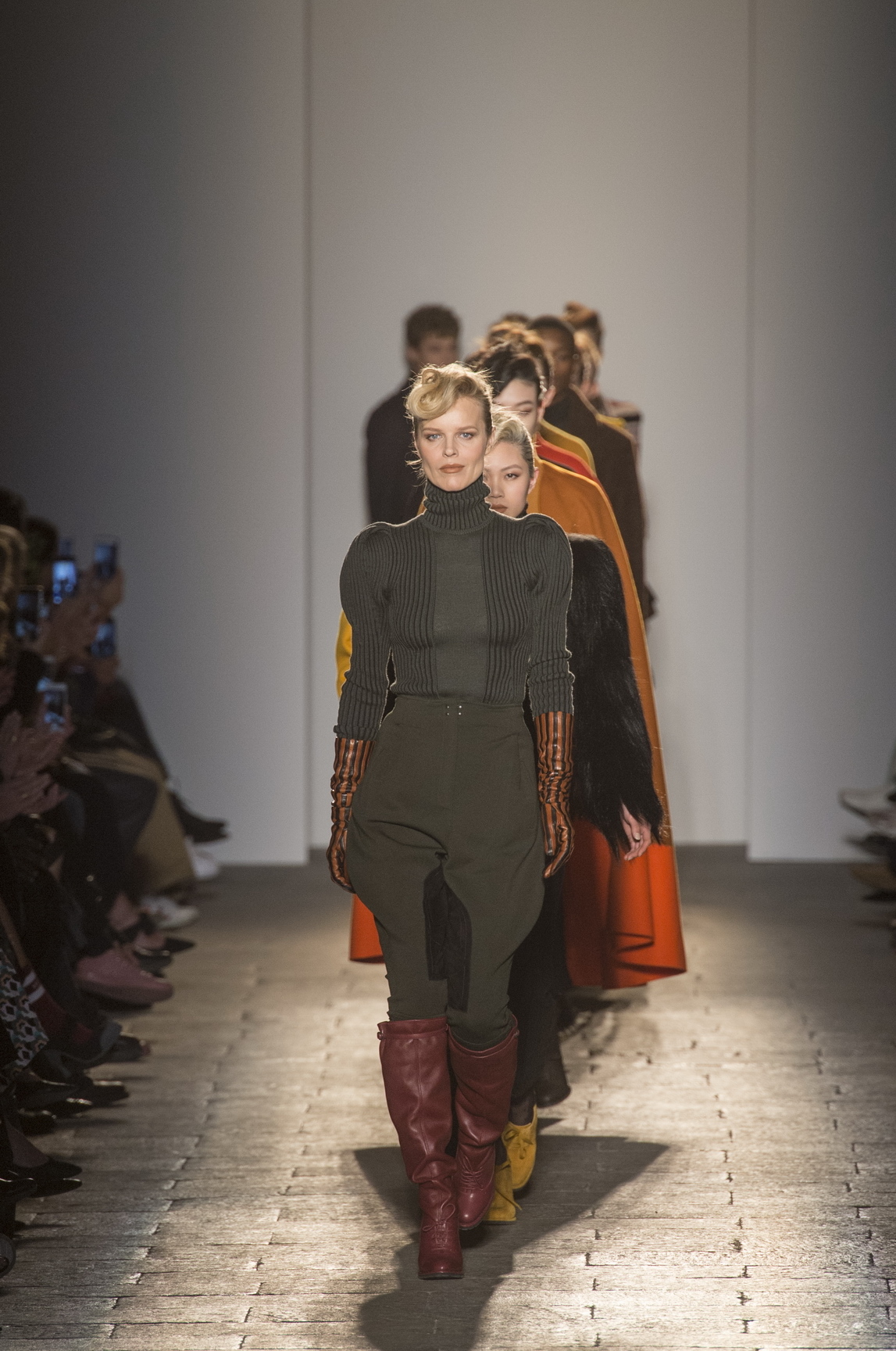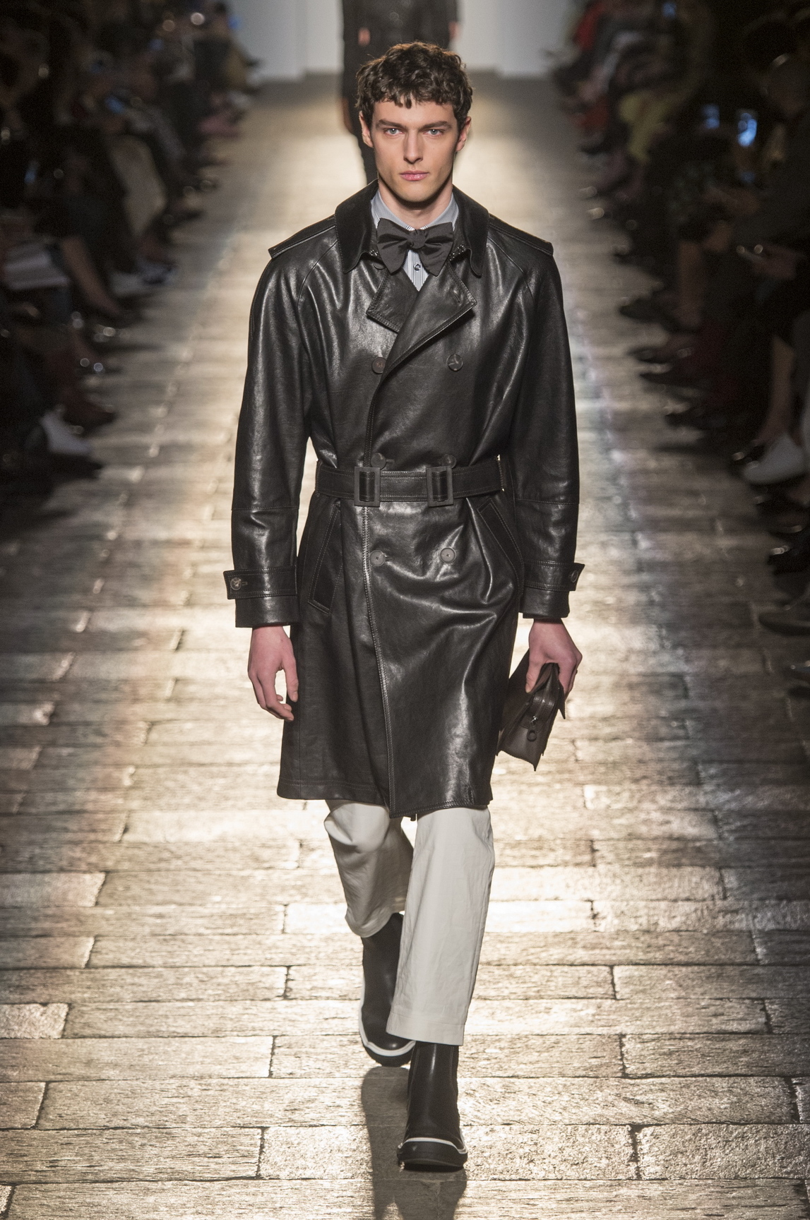 On Saturday morning, Tomas Maier took that look to sculptural heights in a Bottega Veneta collection of persuasive glamour — the kind we associate with Old Hollywood stars like Marlene Dietrich and Greta Garbo, whose seductive powers (and interestingly, often mannish sex appeal) turned them into silver screen goddesses worshipped by their male audiences. Bottega Veneta’s show, where models like Kendall Jenner and Eva Herzigová were glammed up to the nines, instantly had that same effect. There’s just something about the 40s silhouette that totally seduces you as a spectator — male or female — and it was great. Maier’s men’s collection, which he presented as part of the women’s show for the second season, virtually had the opposite effect. His Bottega Veneta man was boyish and elegant, nipped in daintily at the waist in romantic Edwardian tailoring styled with soft dandy-esque bowties. On Maier’s runway, men were boy poets and women femmes fatales, and it cemented the message of this Milan season.