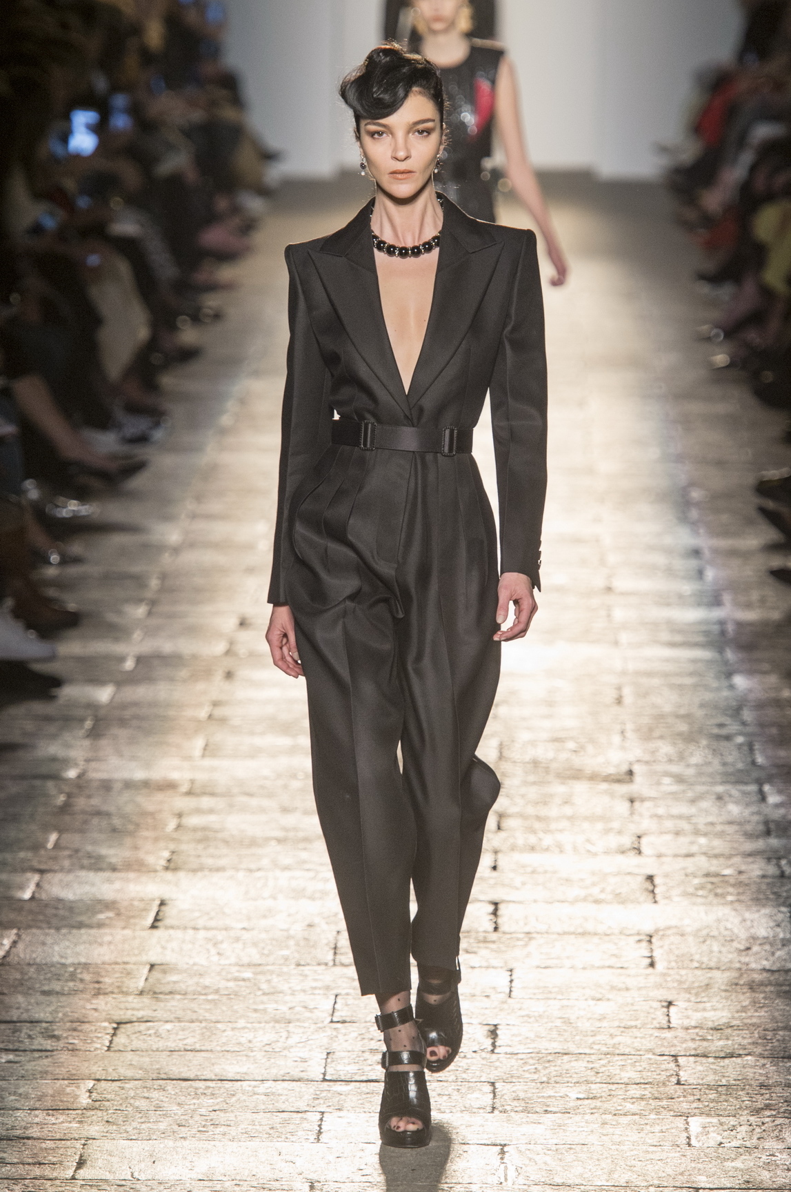 There’s something about trying times and glamour: an electric chemistry between the two, which is always expressed in fashion. It’s that old chestnut about creativity thriving in times of upheaval, a need for escapism, and so on. Glamour, by way of seduction, has taken the shows in Milan by storm this season. Miuccia Prada talked about it backstage on Thursday. “My point is seduction,” she said. “How seduction is necessary.” You could interpret that as fashion’s duty to seduce the consumer, or you could come at it from the wearer’s perspective — the notion of the compelling seductress. On Friday, Donatella Versace dedicated her show to the new battle for equality in a Trump-tastic era where a bunch of old men are making laws about women’s abortion rights (or lack thereof). The weapon she came up with — her collection — was super glamorous and really very sexy. Women’s fashion was never more seductive than in the war-torn 40s, the decade of power-dressing, where shoulders were magnified, waists minimized, and hemlines cut teasingly below the knee.