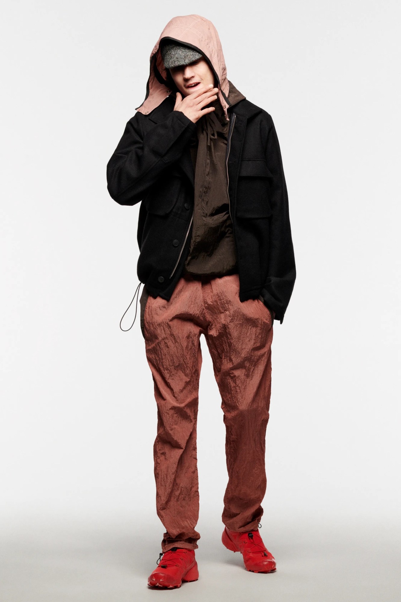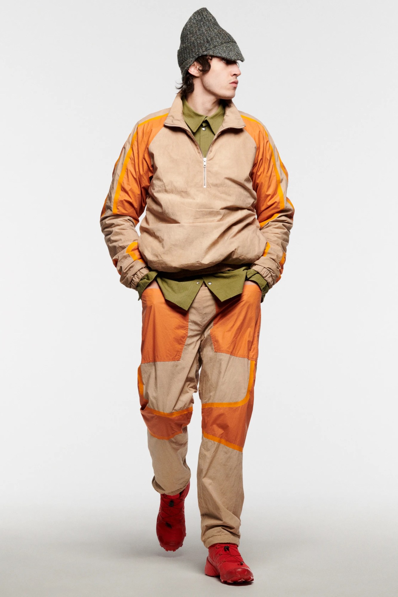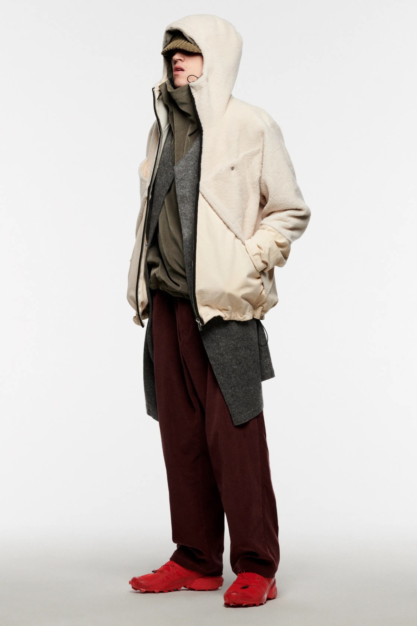 Travel really does broaden the mind, doesn’t it? Two people who couldn’t agree more are the two designers behind British-Icelandic label Arnar Mar Jonsson, Luke Stevens and the brand’s namesake. It was on their regular trips to Northern Italy, where part of the brand’s production is based, that the pair’s eyes were drawn to an archetypal character — the insouciant latter-day dandy seen on terraces nationwide, poring over the morning paper with an espresso in hand, that they’ve since dubbed the ‘maestro’. A nod to the rakish, calmly confident style of these dapper older gentlemen, this season sees the label — once better known for what we once dubbed ‘poetic gorpcore’ — tap into a more textured, casually sartorial energy. It’s something that we saw the beginnings of last season, with the introduction of the label’s signature outdoors-y in tailoring wools, but this season, that extends to earthy cotton corduroys and motted felted wools. Granted, there’s still a bit of gorp on offer here in the form of panelled ripstop jackets and clever fabric treatments — an intentionally abraded uber jacket caught our eye in particular. The overall offer, though, demonstrates an exciting expansion of Arnar Mar Jonsson’s remit — a full wardrobe for any gentleman to wear well into his finest years.