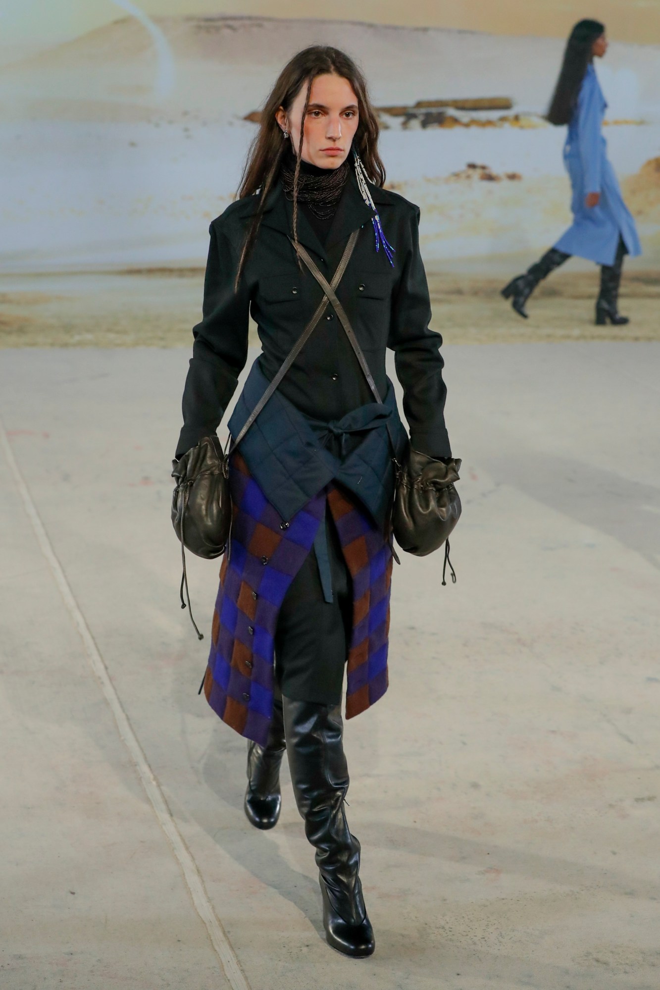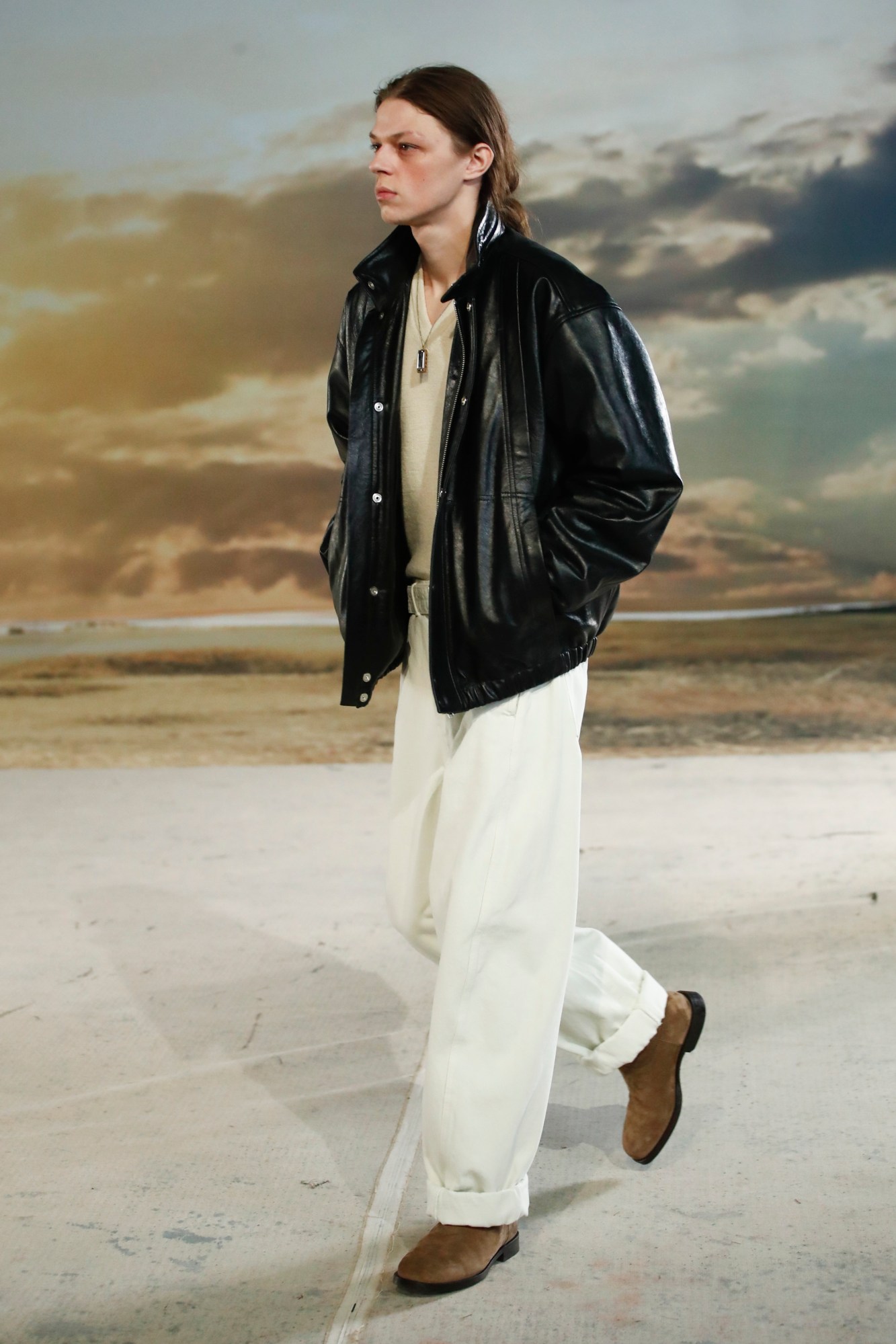 Something tells us that Christophe Lemaire and his namesake label’s creative director Sarah Linh saw Dune at the end of last year. Then again, the French designers have always been fond of a sandy, layered look — except this time it was heightened by a desertscape backdrop and a veil of smoke across the concrete floor of the industrial warehouse he chose to show his AW22 collection in. In fact, it was an imaginary landscape by stage director Philippe Quesne — thirty metres of painted canvas, “a memory bathed in the humid, autumnal light of the sun soaking up the sky after the rain.” The sun-baked clothes couldn’t be more fitting, the premise of them was a kinetic sequence of shedding layers and swelling silhouettes — ideal for temperamental sunny-rainy weather, it should be noted — with models emerging in clusters and wandering the vast space as if they were foraging for mushrooms in that sandy backdrop. It was distinctly outdoorsy, in that everything was exquisitely layered to convey, as the show notes put it: “an urban horde of modern-day hunter-gatherers … who leave in their collective wake the irregular trail of a tribe in which everyone advances at their own pace, but is united in heart”.