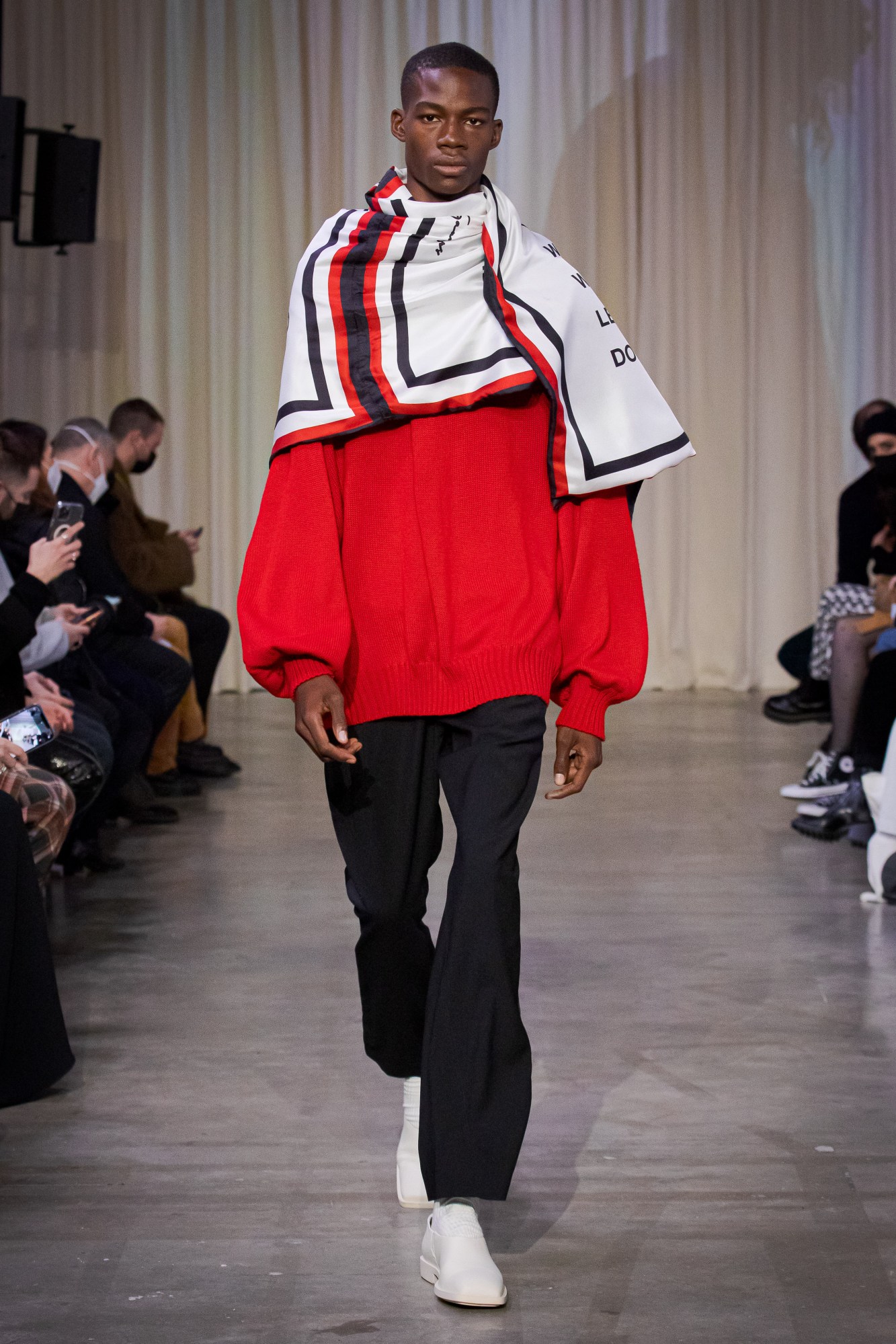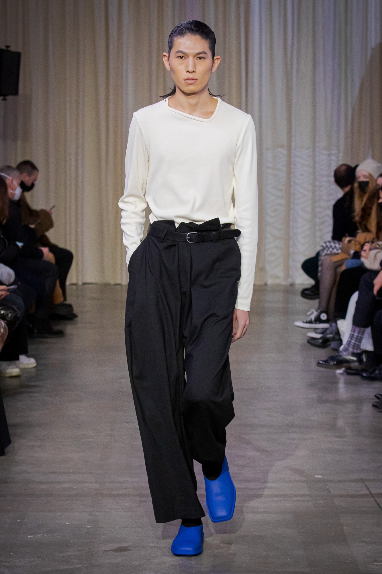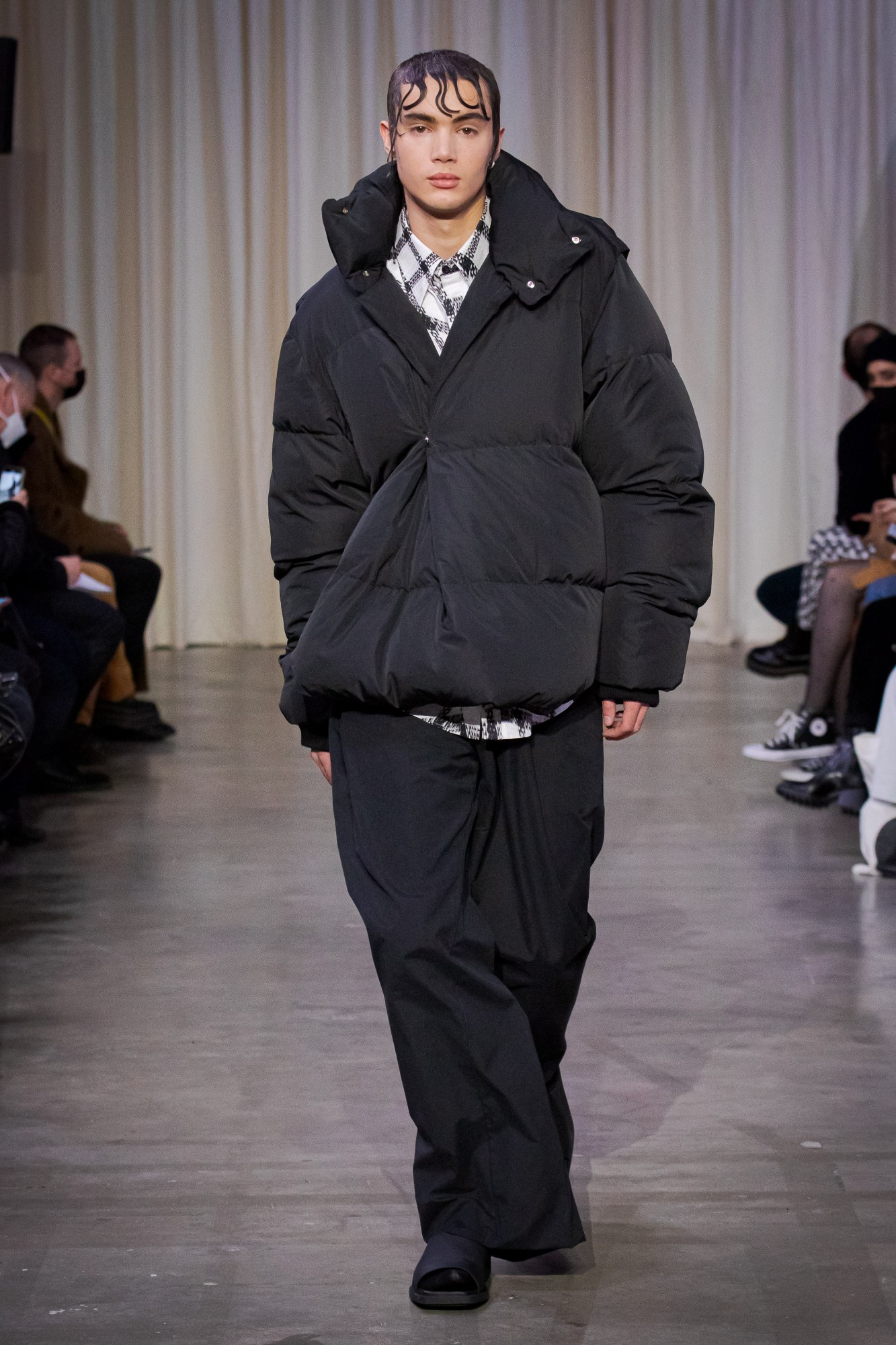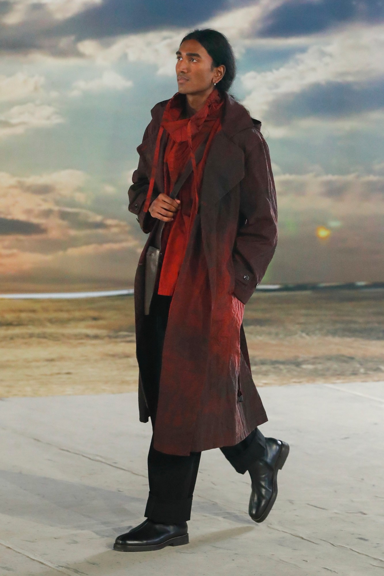 Dreamy, right? Here were perfectly slouchy pants, co-ordinated ensembles of parkas with trailing lo-fi fastenings, skirts draped with panels of leather, drawstring bags slung across the back or waist, like quiver-knapsacks carrying more layers to protectively armour up or camouflage oneself in darkness. It was a lesson in making classic pieces feel new all over again, like a boxy black leather trench coat with two exaggerated lapels in contrasting crisp-white cotton. Ultimately, all of the clothes were beautiful — after all, Christophe used to work for Hermès, so he knows how to make a timelessly beautiful object — but what the show conveyed was how it could all be worn together, the art of layering and delayering to create a personal point of difference. “It’s all about movement, walking, racing forward every now and again,” the show notes continued. “The movement of the body in time and space, sweeping along the fabric, the garments, which themselves enliven, release, anticipate and prolong the momentum.” OA