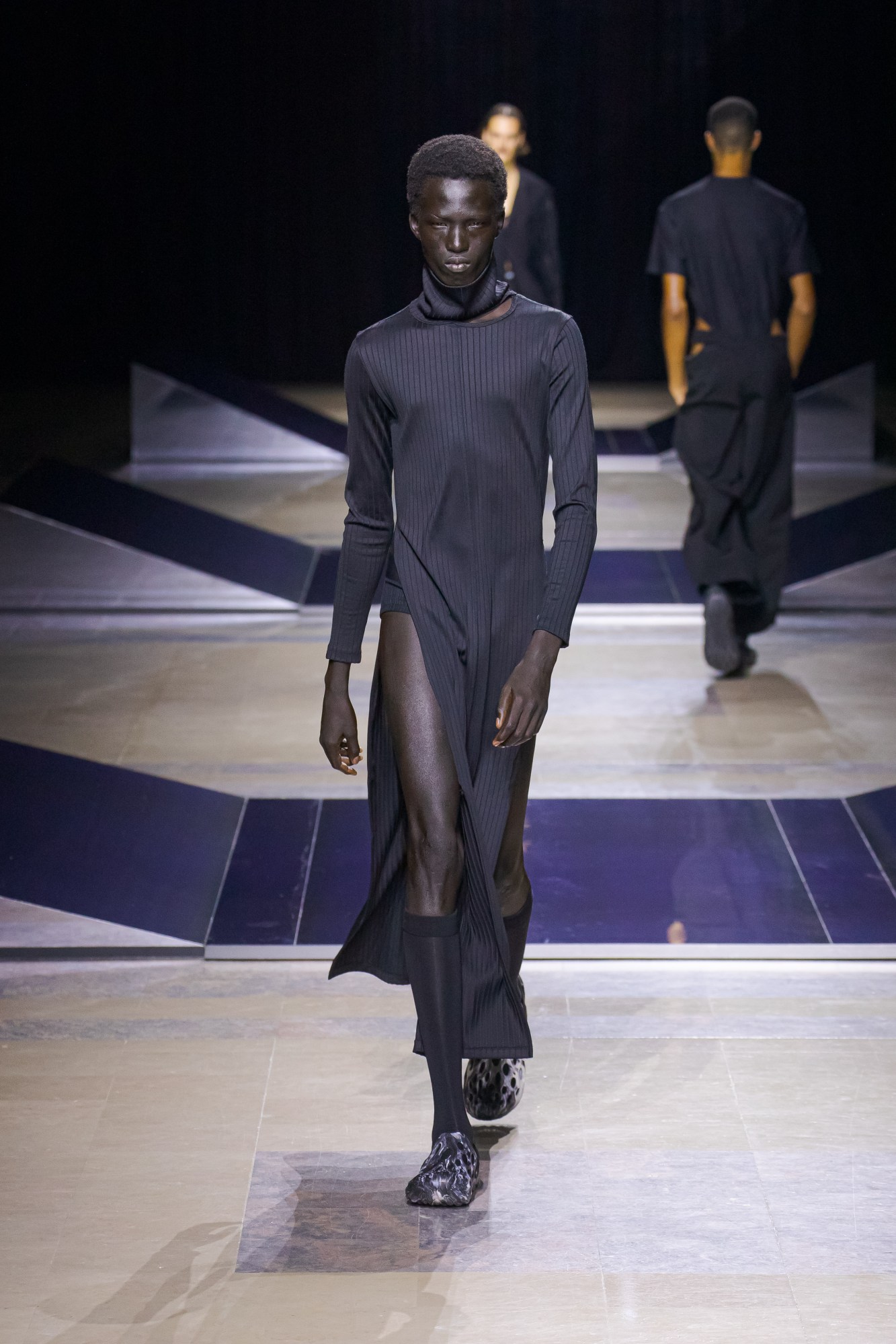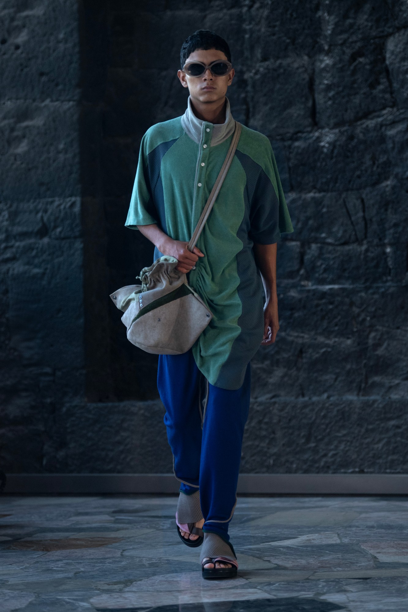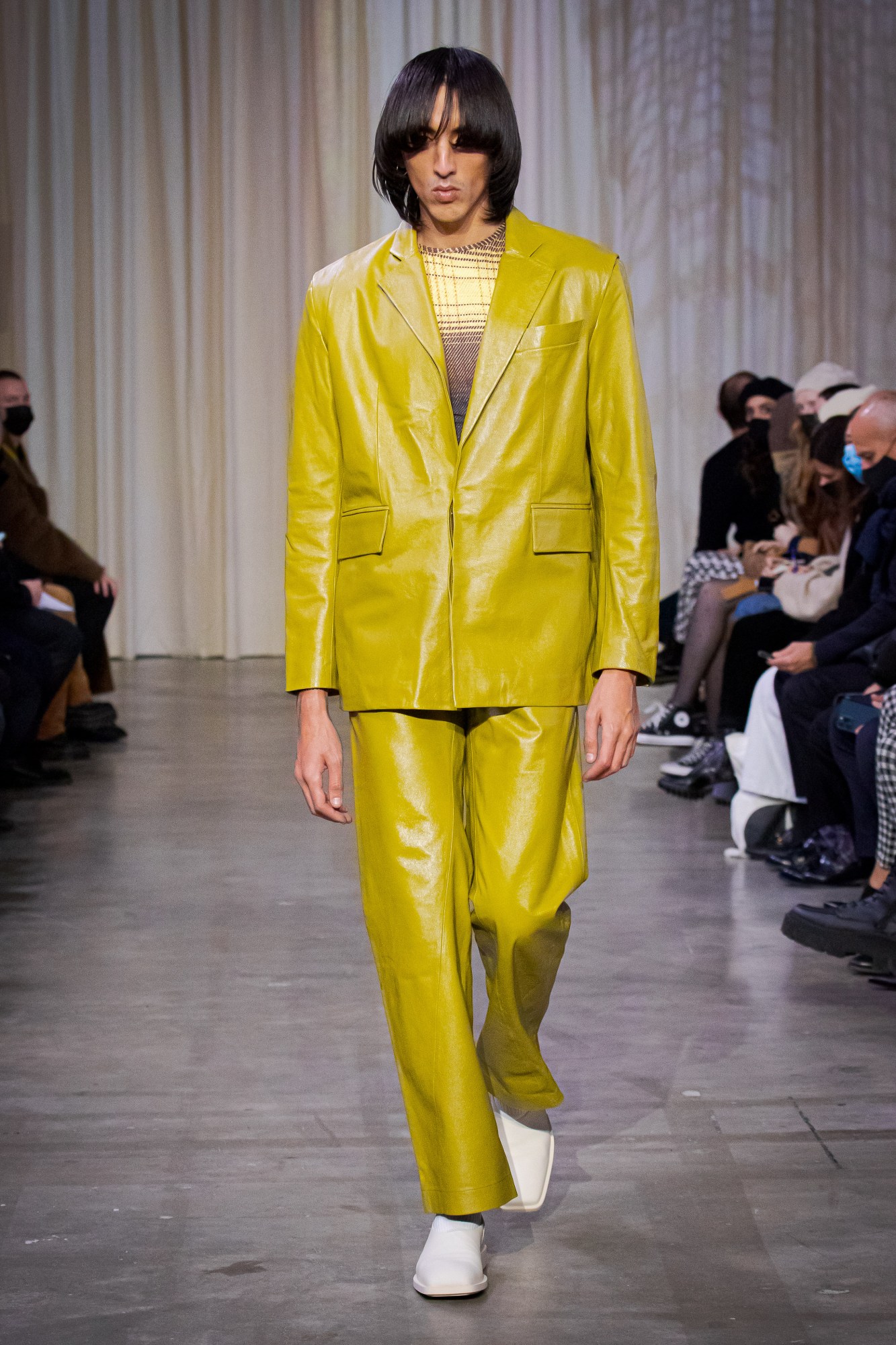 While this wasn’t necessarily a call to all get high, it certainly conjured the energy of spaces where you’ll find plenty of people who are. A sensual, clubby spirit permeated jersey singlets, tripped-out prints on viscose shirting, and laddered knit tank tops. And gossamer tailoring was marbled with transparent swirls, evoking the clinging sweat patches that are the natural consequence of a night’s hard dancing. For when things really start to heat up, though, Louis sent a suite of toned, oiled bodies down the runway in tank-top and hip-cut-out brief combos in mustard and taupe jerseys, triggering the sort of thirst that only those who have been at a rave where the free water runs out will know. Still, it wasn’t all about baring it all – an inevitable part of any night out is eventually having to head home, a fact catered to by the ample offering of hulking wool overcoats to bundle up in while waiting for your Uber. MS