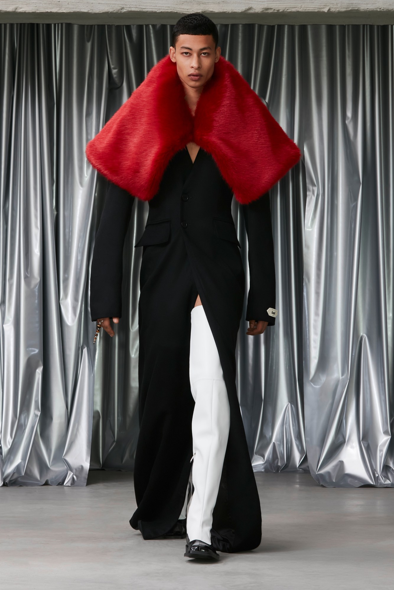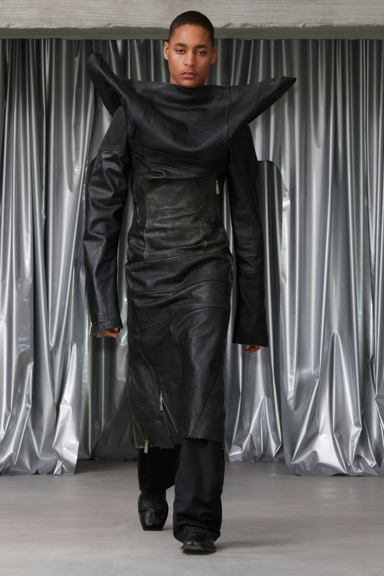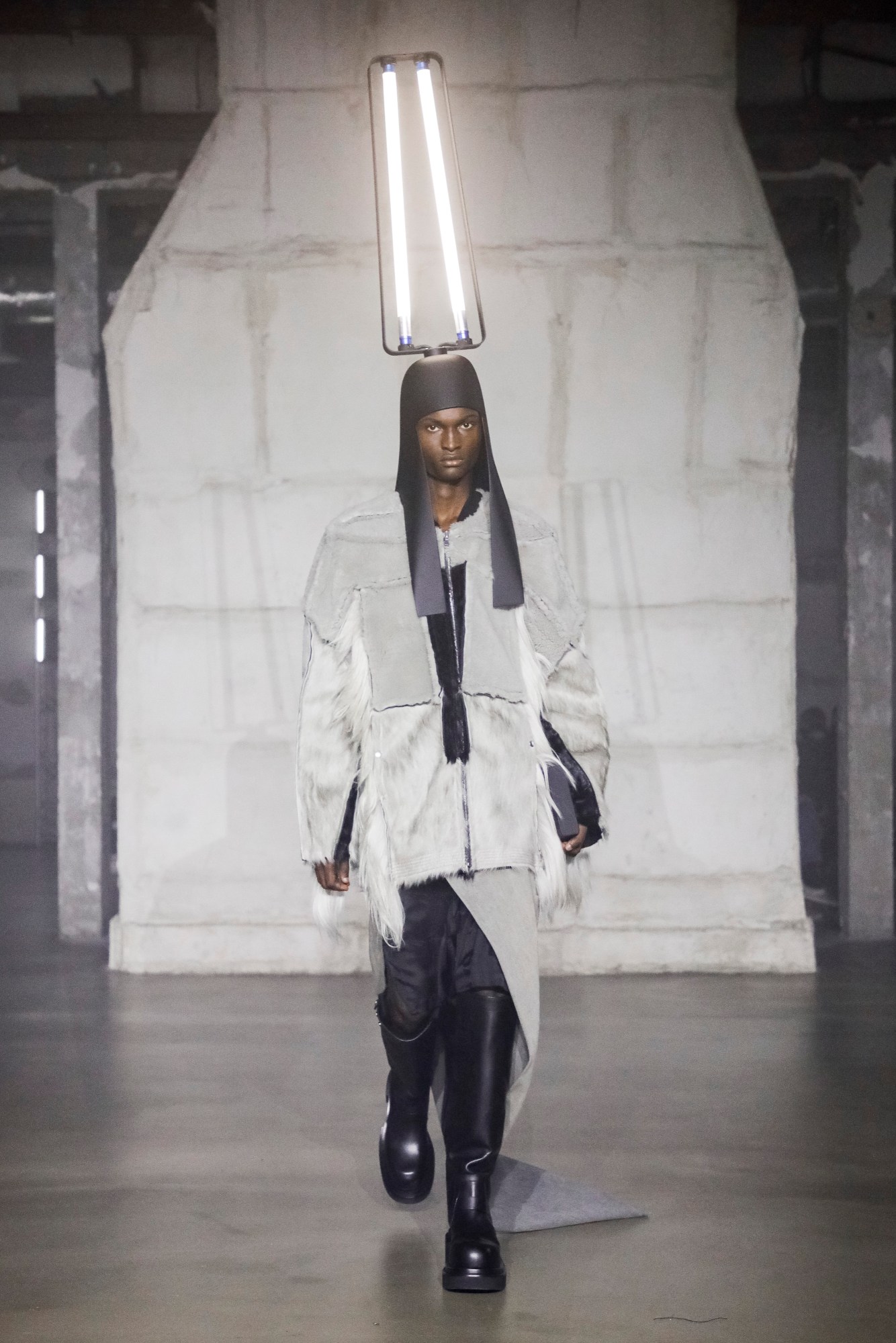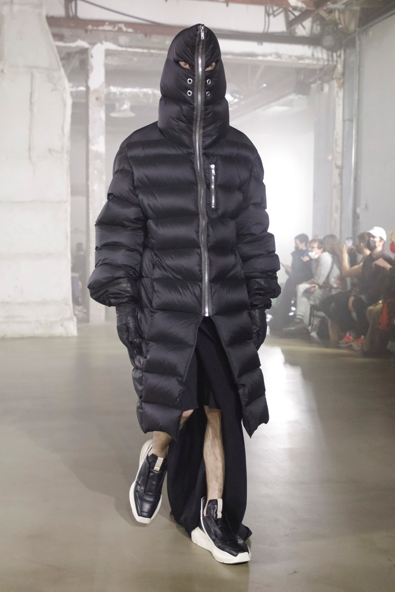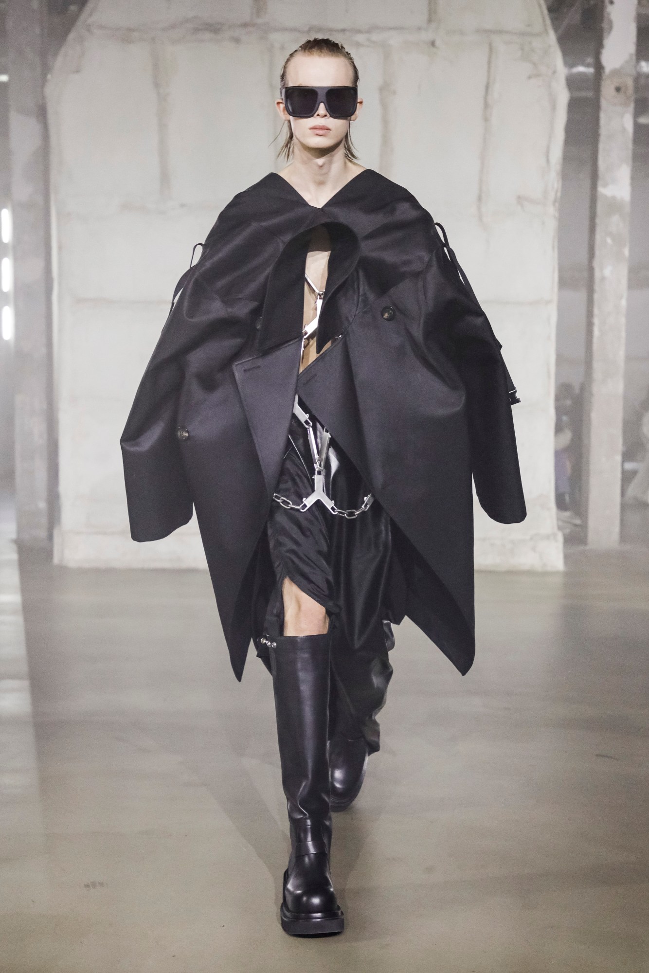 Hardcore doesn’t come harder than Rick Owens. You never know what’s going to come down the catwalk at these shows, but you can bet that it’s going to be something mind-blowing. This time, it was sex-club bondage, gimp masks (we could have sworn some of them were in cashmere), and protruding silhouettes that transformed the human body into otherworldly alien-y figures. Oh, and helmets with Dan Flavin-like strobe-lit horns. “In this age of immediate gratification and meta-self-invention more than ever before, maybe indulging in my id is ultimately the wisest path,” reflected Rick in his open-letter show notes. The languorous sleazy-glam light seekers, he added, reflect that mood. Set against the epilepsy-inducing flashing lights and The Sisters of Mercy’s Lights, almost every look in the collection had a great piece of outerwear: sculptural duvet-style padded pieces, deconstructed shearling-trimmed parkas, bulbous hoodies zipped up all the way to conceal the face entirely. Rick said that they still had “exaggerated shoulders that I had started doing as a parody of masculinity but ended up enjoying wearing … an excuse to take up more space around me.” In fact, he closed the show himself in a broad-shouldered overcoat, complete with a balaclava. All of the cotton, he also pointed out, were certified-organic cotton, and he listed the family-run mills that work with slow-weaving techniques. Don’t call it virtue-signalling, but Rick says that the “balance of virtuousness and cheerful degeneracy” has always been his Holy Grail. It begs the question: why shouldn’t sex-club gear be more sustainable?