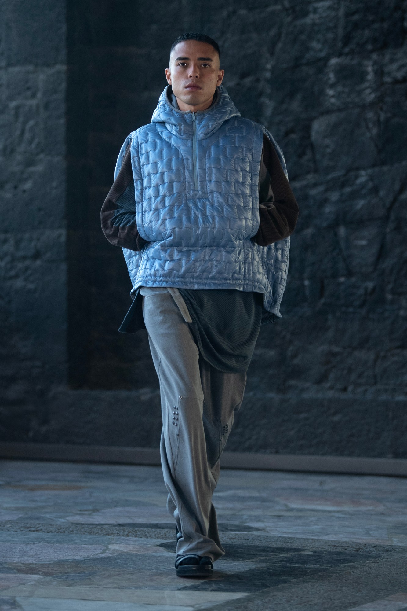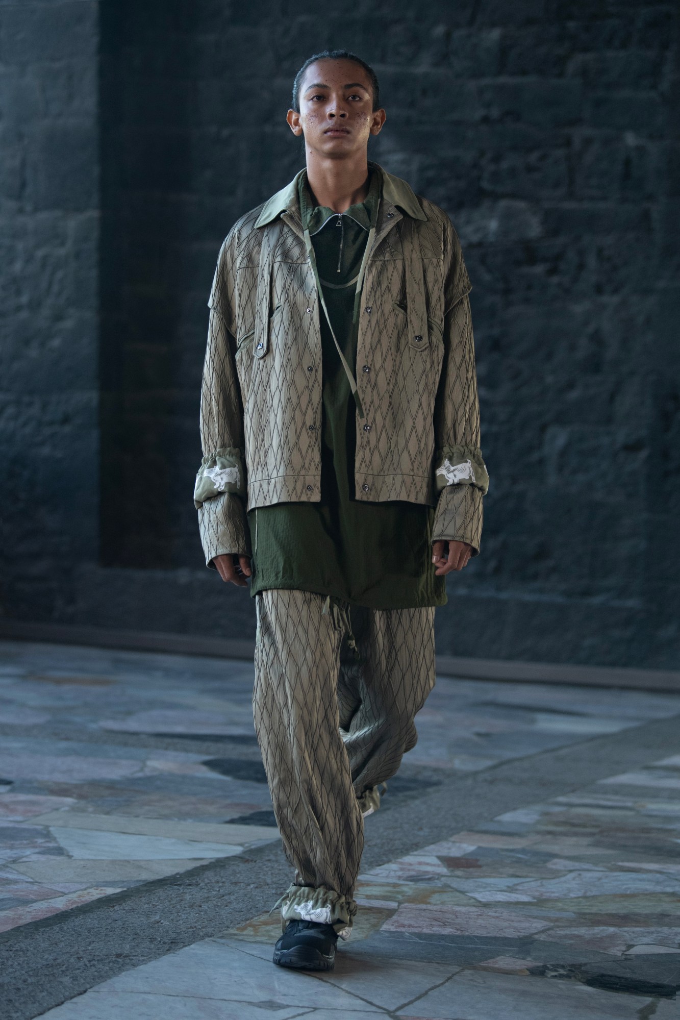 It started – as any good role-player game does – with a protagonist: the City Elf. An embodiment of the often neo-medieval tone and atmosphere of the games he used to play, looks were caught in a balance between vague futurism and a decidedly analogue approach to clothes to clothesmaking. Streams of delicate floral crochet draped around the mandarin collars of puckered poplin shirts, down dapper wool coats, and covered the lapels of rounded tailored jackets, and loose button down separates with pooch-embroidered cuffs were cut from speckled tweeds. This season’s knits – spanning wide-gauged earthen-hued cardigans and sorbet-tone hoodies – brought a reassuring sense of the hand into the mix, while patchworked, thick-soled leather climbing shoes gave the looks a sporty/gorp-y accent Slinky, Link-from-Zelda jersey leggings, militaristic epaulettes, tunic-proportion jumpers and jackets in shimmering diamond-graphic jacquards pushed the RPG-core fantasy further, but balancing those out were slouchier, hooded looks designed with our elfen hero’s return to the real-life city in mind. They were inspired, Kiko said, by “people dipping out with a little hoodie on to get a Pot Noodle”. Well, if you can make that look chic, you’ve won. Game well played, Kiko! MS