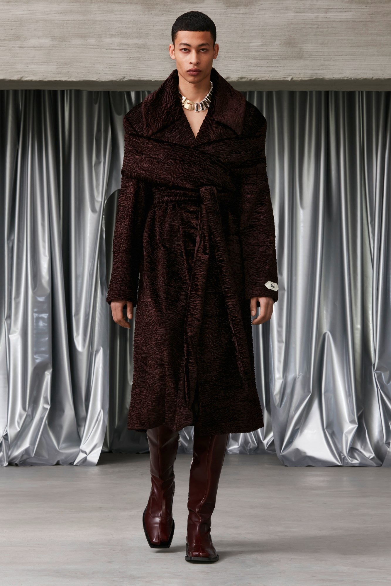 The result isn’t so much a study of the dress codes of those specific communities, but rather a figurative meditation on “how a language of clothing evolves within communities, mixing and contrasting pieces together.” Oversized tailored coats in dark, hearty tweeds were worn over tin foil-effect shirting, and cosy sweats came with disco-y sequinned cummerbunds. Flecked, wide-gauge knits read of humble familiarity and tradition while bricolaged denim flares and a patchworked brocade waistcoat and pair of wide-leg jeans suggested a zesty, almost-hippy-ish spirit. These were the looks that really spoke to the collection’s central ethos – it was a collage “moods and feelings,” said Johnny, “and a reflection of the way we live now.”