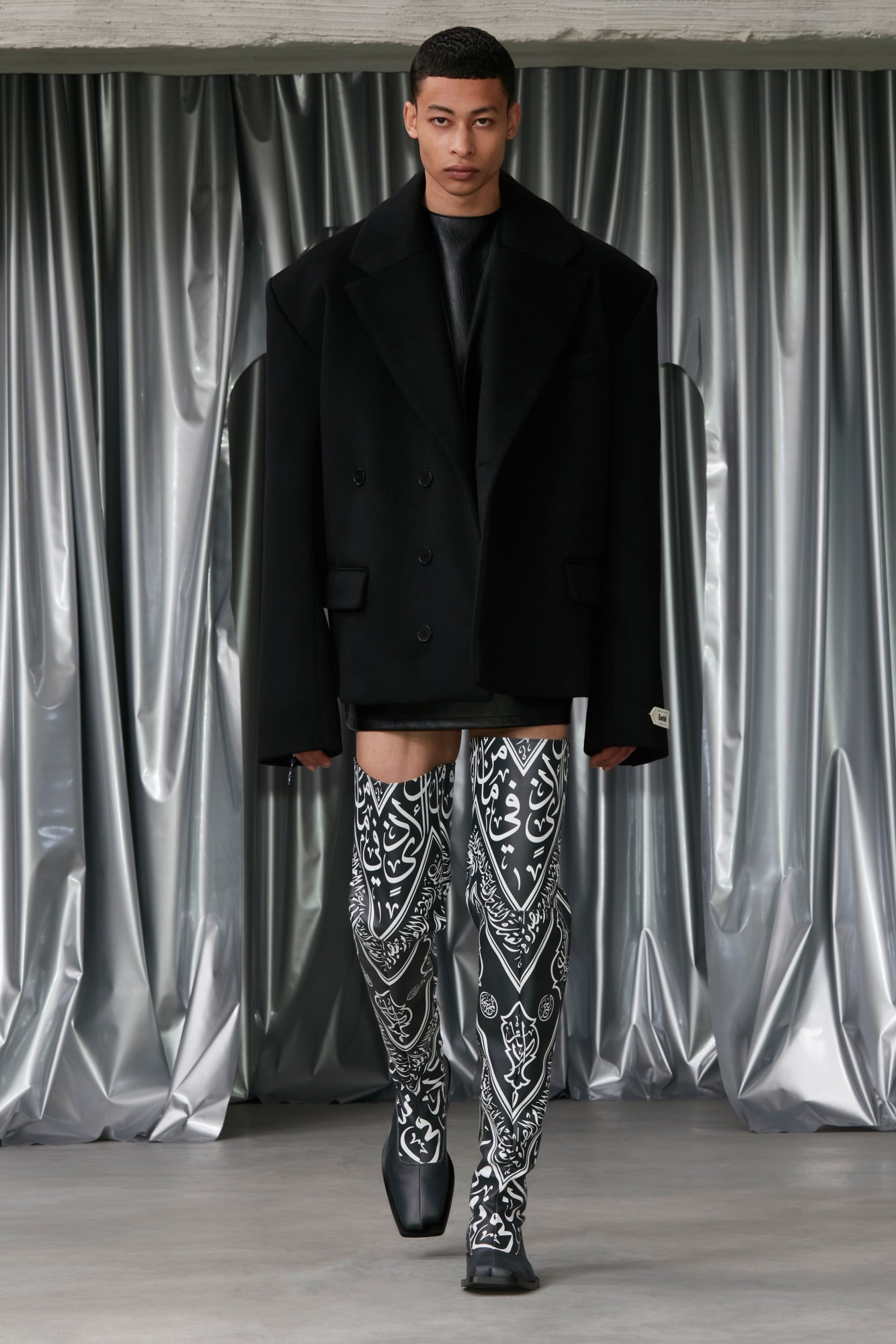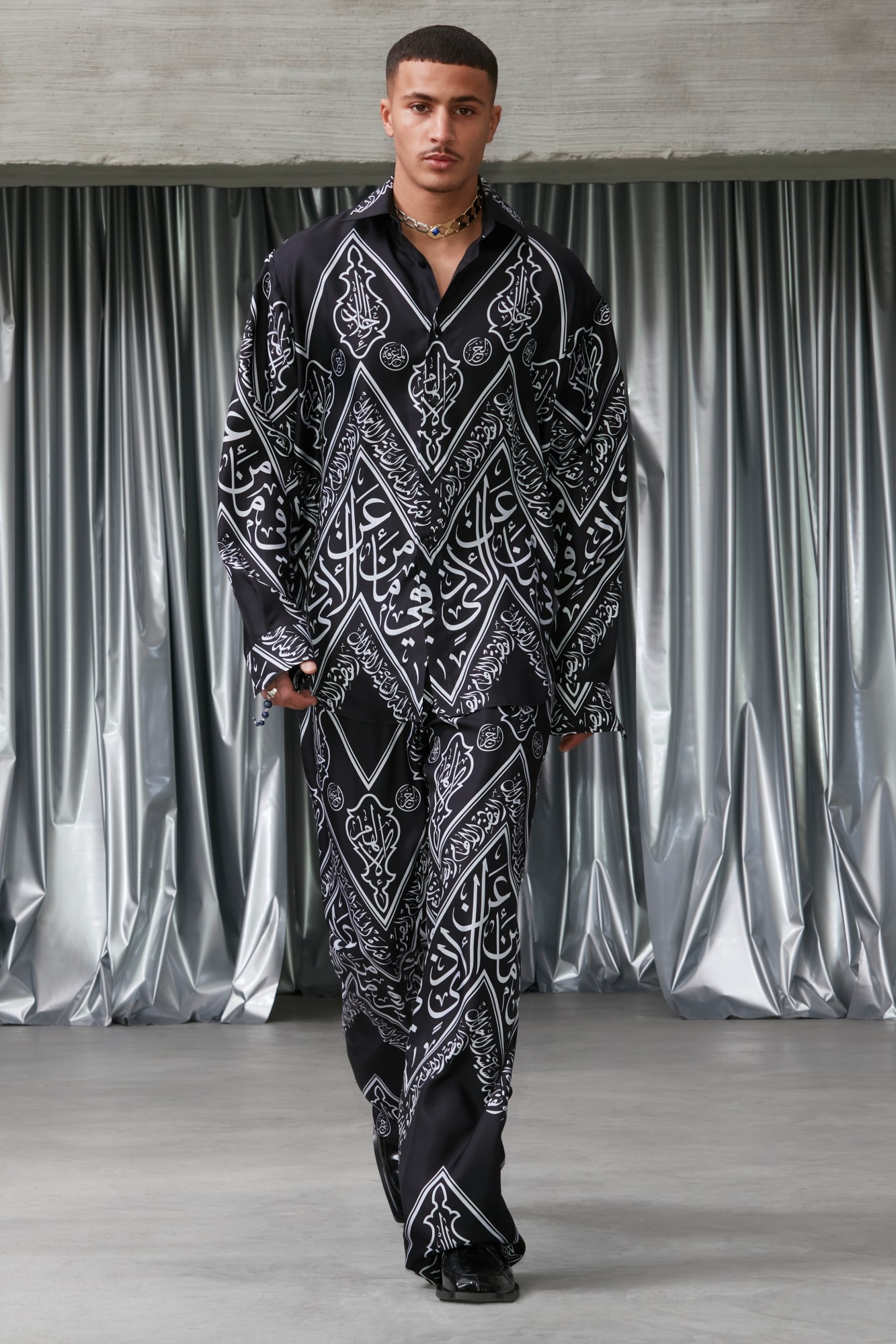 For Benjamin Alexander Huseby and Serhat Işık, the duo behind Berlin-based label GmbH, the personal and the political have always been inextricably linked. While that remains the case this season, the pair decided to lean further into the forme than we’ve ever seen before, presenting “Talisman” – a rich exploration of themes of protection, queerness, couture, spirituality and Islamic culture. Featuring cleverly subversive twists on religious garments, high camp silhouettes, and dazzling calligraphic prints, it was a collection that consciously interrogated assumptions around motifs and modes of dress, while also serving up the sensually charged, impeccably cut clothes that their ever-widening audience is after. Head here for our full review. MS