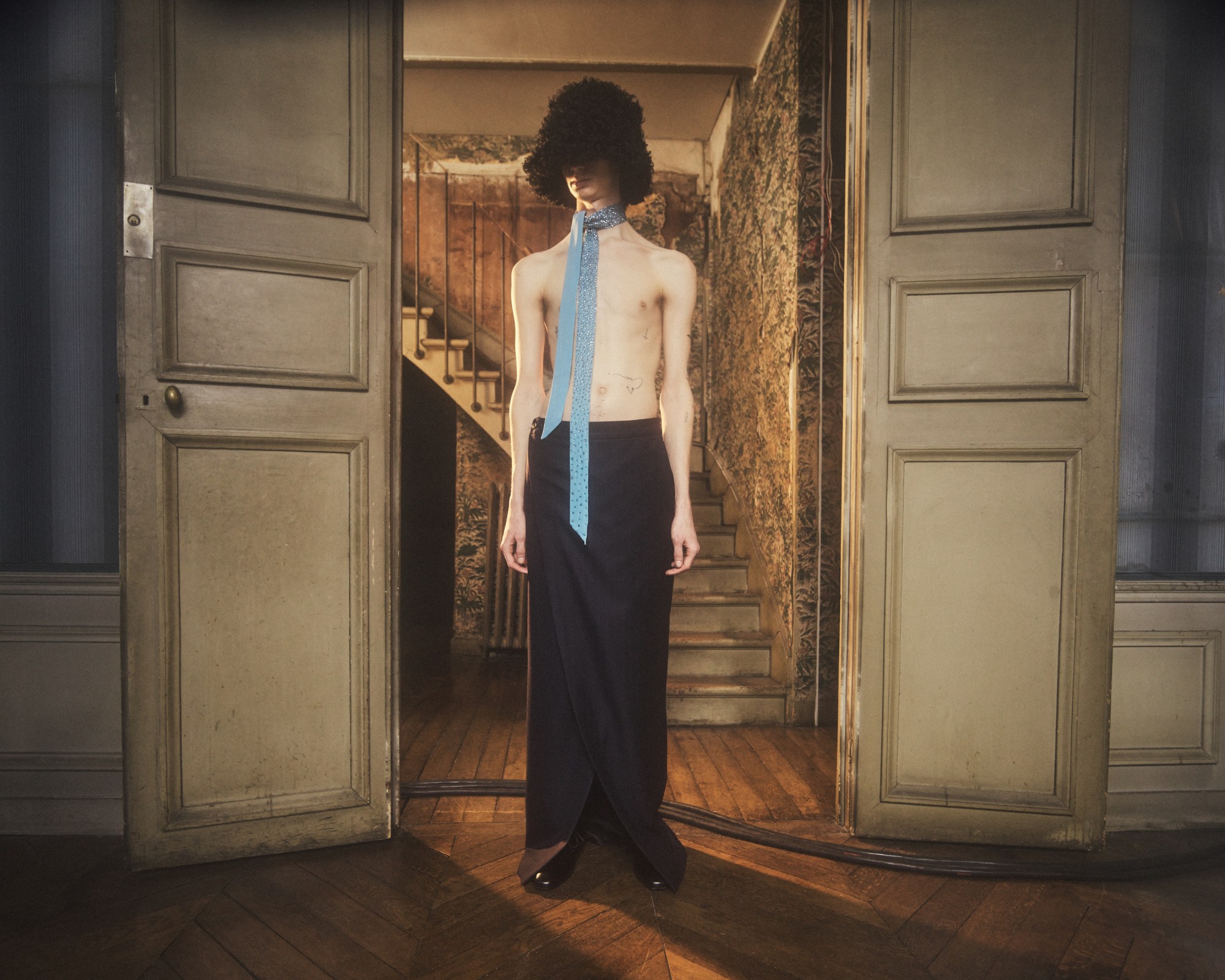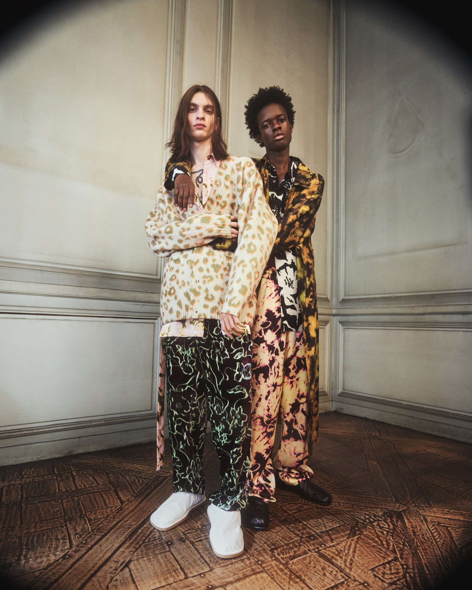 “Raucous beauty. Tender gender. Blurring lines.” writes Dries Van Noten in the opening line of the show notes for his latest menswear collection. They’re all terms that are very much in fashion – chiming well with a widespread appetite to be liberated the shackles of social conventions. As ‘now’ as the verbiage is, it’s a sentiment that‘s not only mirrored but loudly amplified by the clothes. Showcased in a surreal film shot in a Parisian hôtel particulier by Casper Sejersen, the 43-look ensemble leans into the spirit of eclecticism we’ve seen across the show this season, favouring a freewheeling celebration of colour, cut and texture over zeroing in on a particular ‘point’.