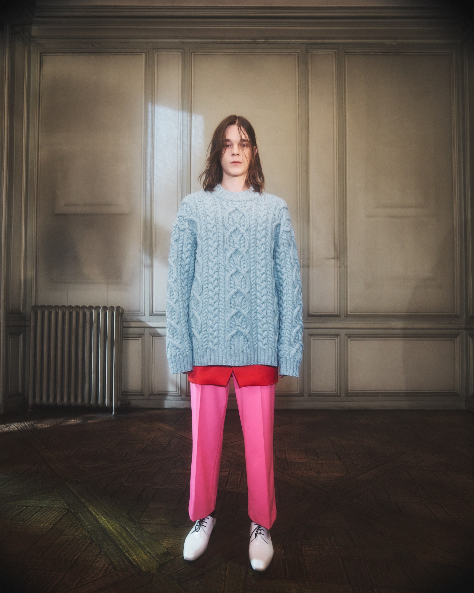 Prim, inky wool coats with set-in sleeves sit alongside frothy sky blue fleece jackets, and chunky grey cable knits are worn with bubblegum pink cigarette pants. Wide-lapelled white tuxedo jackets were worn with ballooning high-waisted trousers, while the staid cosiness of cream ribbed rollnecks was offset by shimmers of lurex and mottled garden foliage prints. This was indeed a collection that exhibited variety, that’s for sure, but where it found its through-line was in the joy that obviously found in creating clothes you need to feel and wear to really appreciate. “It is all about having fun again, “ the show notes read, “touching, kissing people, exploring the forbidden, living carefree” – about refusing to live life vicariously, and relishing real experiences once again. MS