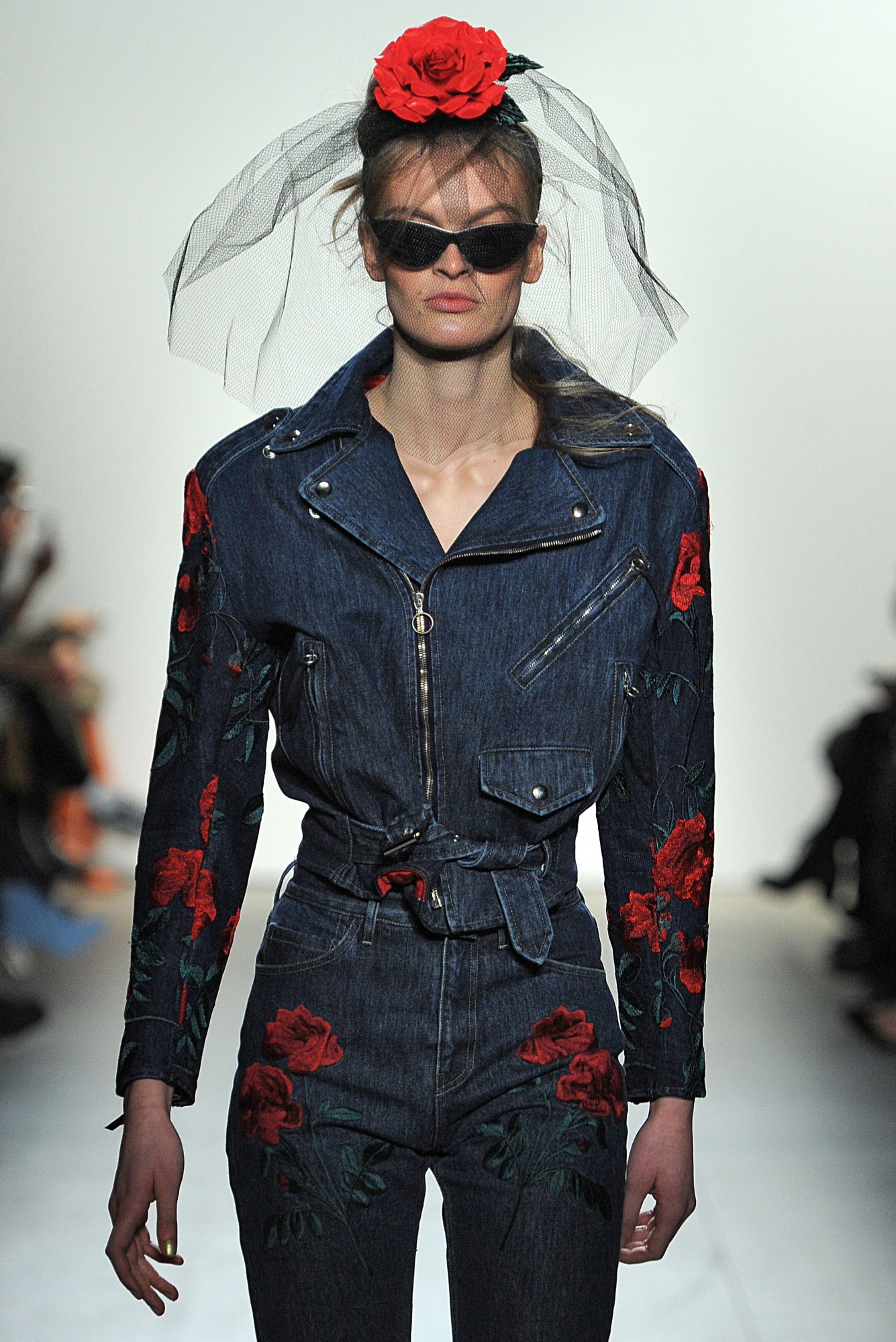 Lately, the Canadian tuxedo has been crowding not just red carpets but also runways. Raf Simons’s debut collection for Calvin Klein tapped into the brand’s all-American denim DNA, showing skinny jeans worn with matching denim shirts — red stitching for model Camille Hurel and yellow for Skylar Tartz, who both also wore cotton turtlenecks and cowboy boots. Tom Ford’s buzzy spring/summer 18 collection included navy Canadian tuxedos accessorized with matching handbags and denim shoes. Maria Grazia Chiuri brought the look to Paris for her second Dior collection, which incorporated workwear silhouettes in light denim printed with talismanic symbols. Adam Selman’s fall/winter 17 denim jumpsuits were full 50s badass — skinny, motorcycle style, and embroidered with red roses. That same season, Marc Jacobs channeled hip-hop culture, adding a shearling lining to an oversized denim jacket that Lineisy Montero wore with matching slouchy jeans — in the same hue as workwear OG Tupac’s iconic 90s denim looks.