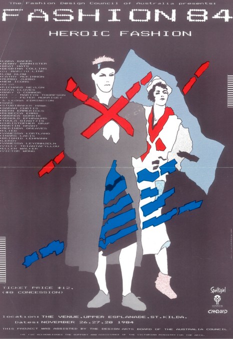 The FDC would host a range of parades and exhibitions with one major showcase at the end of each year. Every year the parade accelerated in scale and size; the ‘Fashion 84’ event titled Heroic Fashion boasted over 30 designers, 100 models and was presented over three consecutive nights at the now-closed St Kilda nightclub, The Venue. In 1987 the FDC moved its parade to the 3000-seat Palais Theatre. The following year a Nestlé sponsorship saw the 88 and 89 shows relocating to Rod Laver Arena, a venue with a seat capacity of 15,000. The shows themselves would combine music scores, performance, art and theatricality on a scale that was unique for fashion at the time.