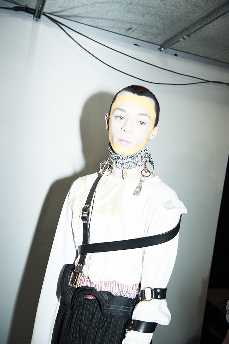 A retelling of this latter point was at Hood By Air’s spring/summer 17 show, featuring Pornhub logos, and awkwardly titled Handkerchief. At the show, models performed stroppiness: they texted on their phones, or knocked their bags against the heads of people in the front row. Some wore double-facing cowboy boots, and limped down the catwalk. The visual intensity of their mutant silhouettes, lurid colors, slogans, 2D-flatpacked shirts, sleeves down to their feet, heads dripping with pomade, was a picture of instability that caricatures our state. But the clothes weren’t wallowing or defeated — they were tinged with obnoxious defiance. They said “fuck off” to what it is we might be facing: essentially, a eugenic antagonism toward Otherness.