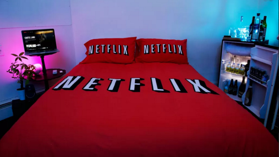 Labeled on the real-estate sharing site as the “Netflix & Chill Room,” the cozy space in a one-bedroom West Village apartment features Netflix-branded pillows and bedspread, candles, a mini-fridge filled with adult beverages, and, naturally, an enormous flat-screen TV linked to an Apple TV and a Netflix account.