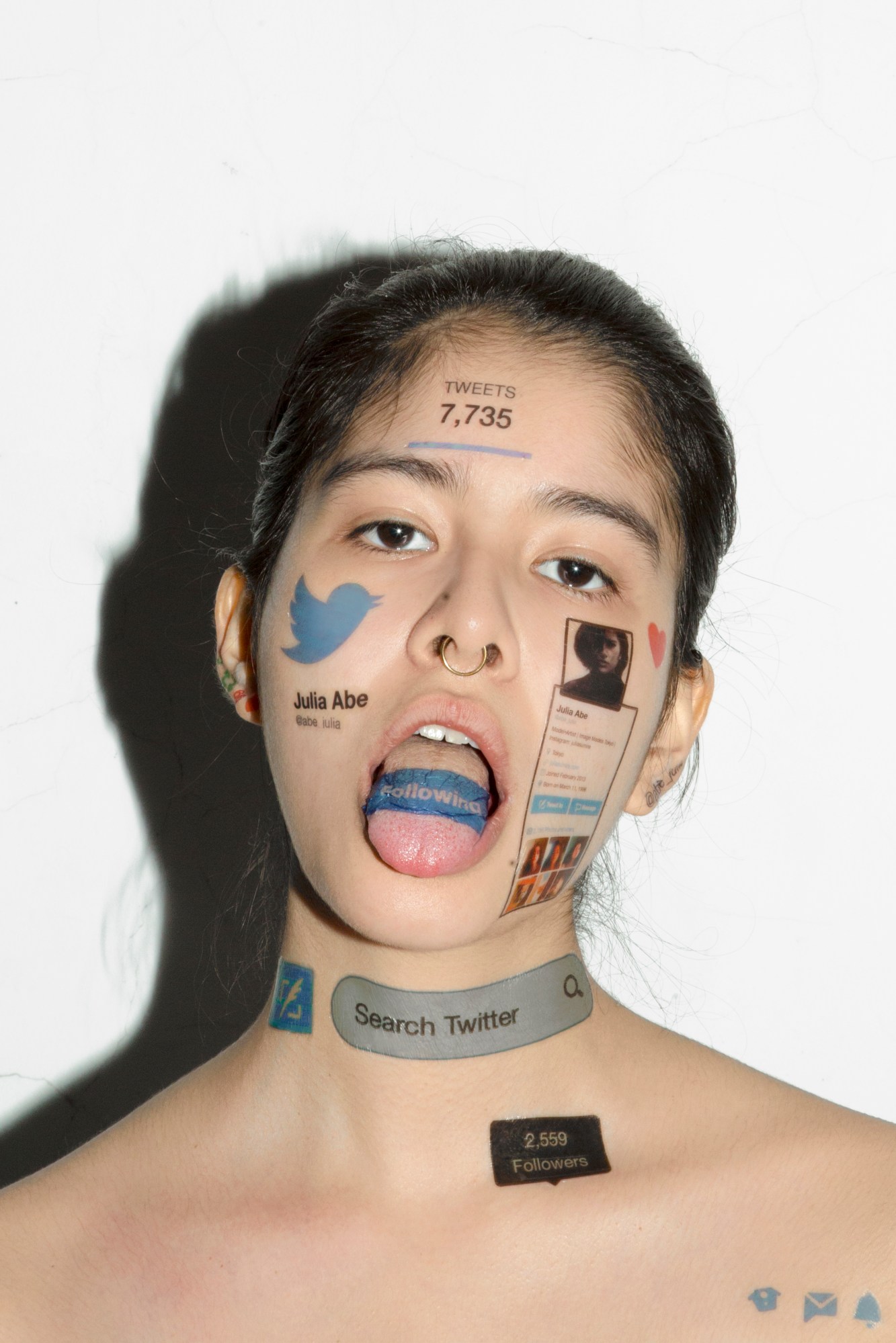 “This is from my Face Post project, where I put tattoos of social media tropes on my friend Julia’s face.”