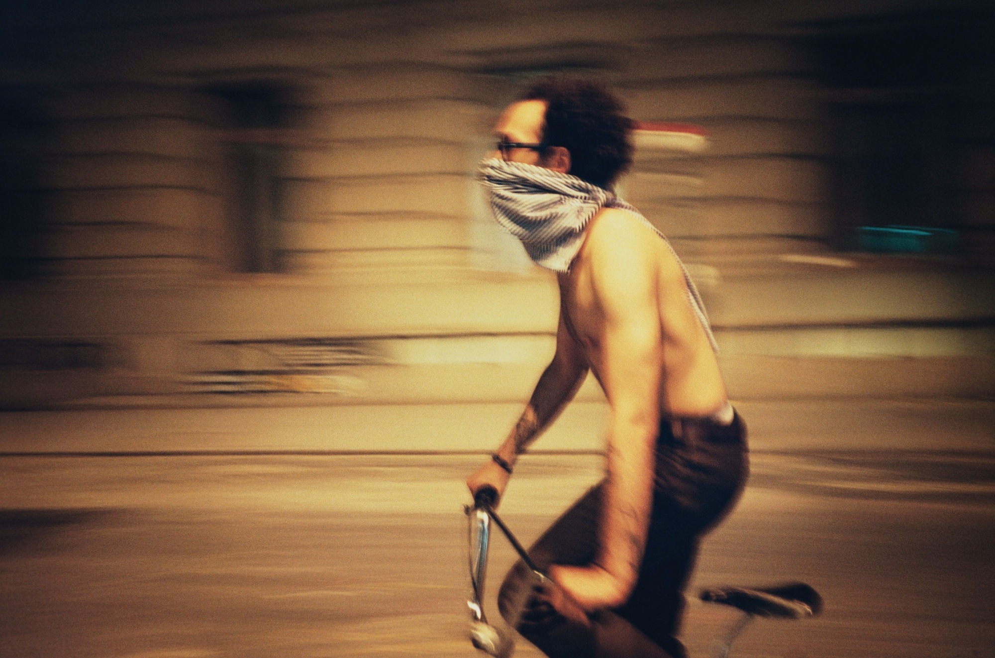 “We went down to Ground Zero to see if we could help out and this is actually at dusk but the cloud of smoke was so dense from the towers falling that it looks like it’s a night photo. This guy is wearing a T-shirt over his face because it was hard to breathe. It was devastating to see. I called Jack Walls and said “The towers fell”, and he said “I know”, and then he said, “You’ve got to get out of downtown.” I said, “I’m going down to photograph it”, and he said, “Of course you are.”