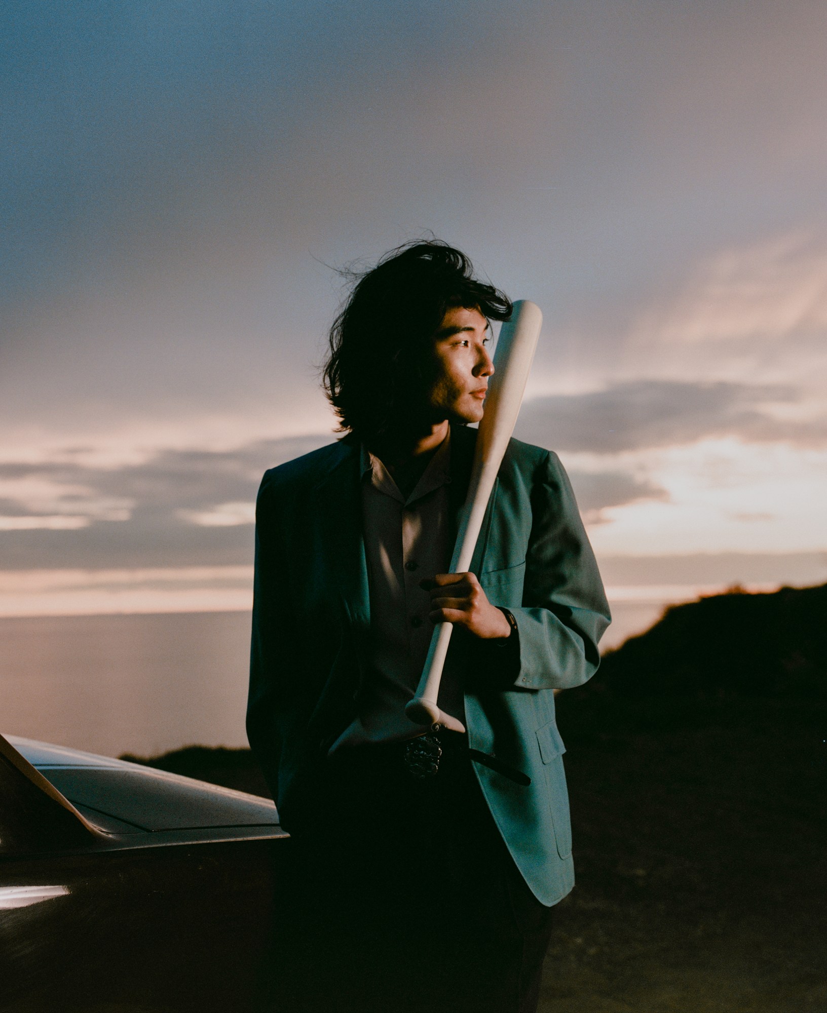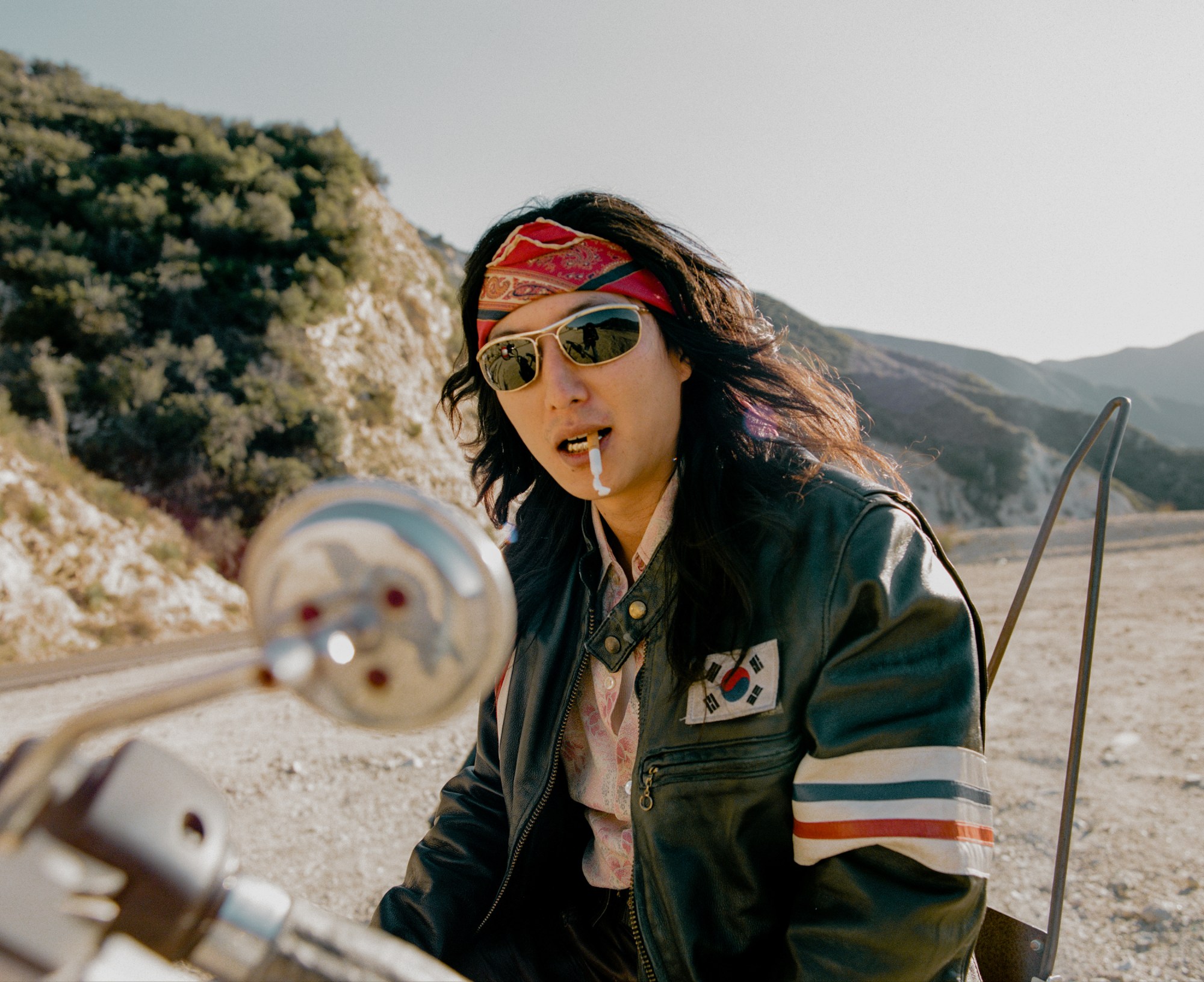 With meticulous detail, Emanuel recreates the romance of Americana in sunset shots of young Korean lovers embracing next to a Mustang. Or in a Hells Angels-inspired shoot, for which he managed to secure the same jacket that Dennis Hopper wore in the classic road movie Easy Rider (1969), this time with the South Korean flag tacked on. These images are his way of “imagining what the Western could look like for someone like me.”