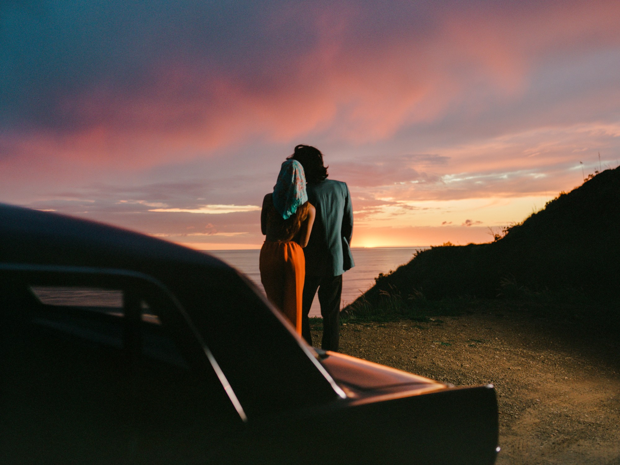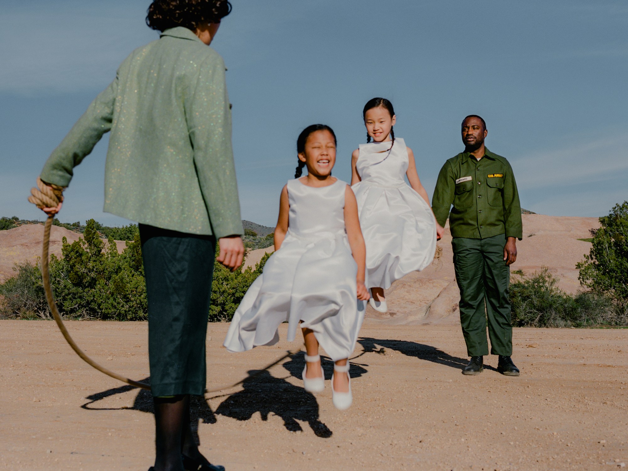 As he acclimatised to LA, his style shifted towards cinematic and staged narratives. Using a grant from the Google Image Equity Fellowship, he assembled a team to help produce America Fever. Though shot in the middle of a real desert, the Korean couple in the first scene, “The Arrival”, poses in front of a painted backdrop inspired by a Hwatu playing card, surrounded by fake cacti sourced from a prop house.
