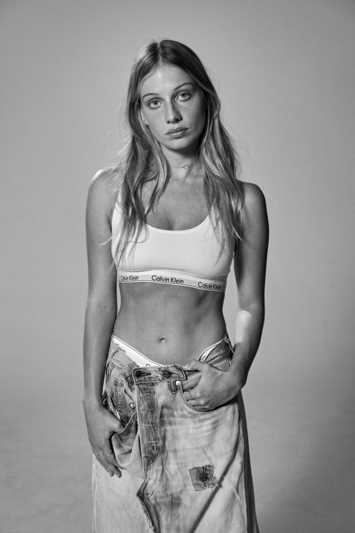 Jeet wearsCalvin Klein bra, Levi 50s customised by i-D, Petite Grand necklaces and rings.