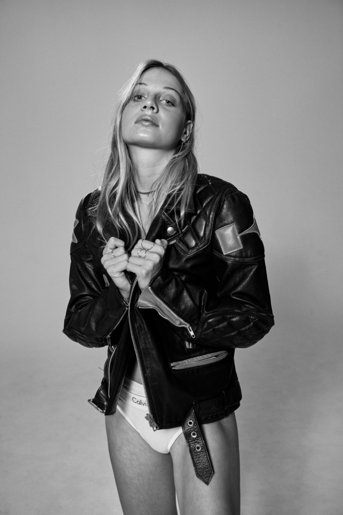 Jeet wearsVintage leather jacket from Route 66, Calvin Klein underwear, Collina Strada underwear(worn underneath) Petite Grand earrings.