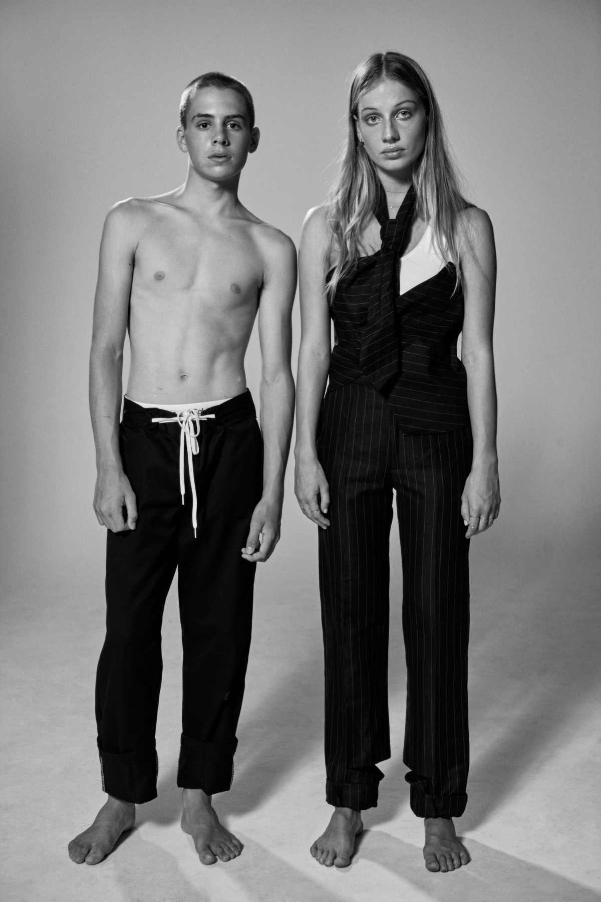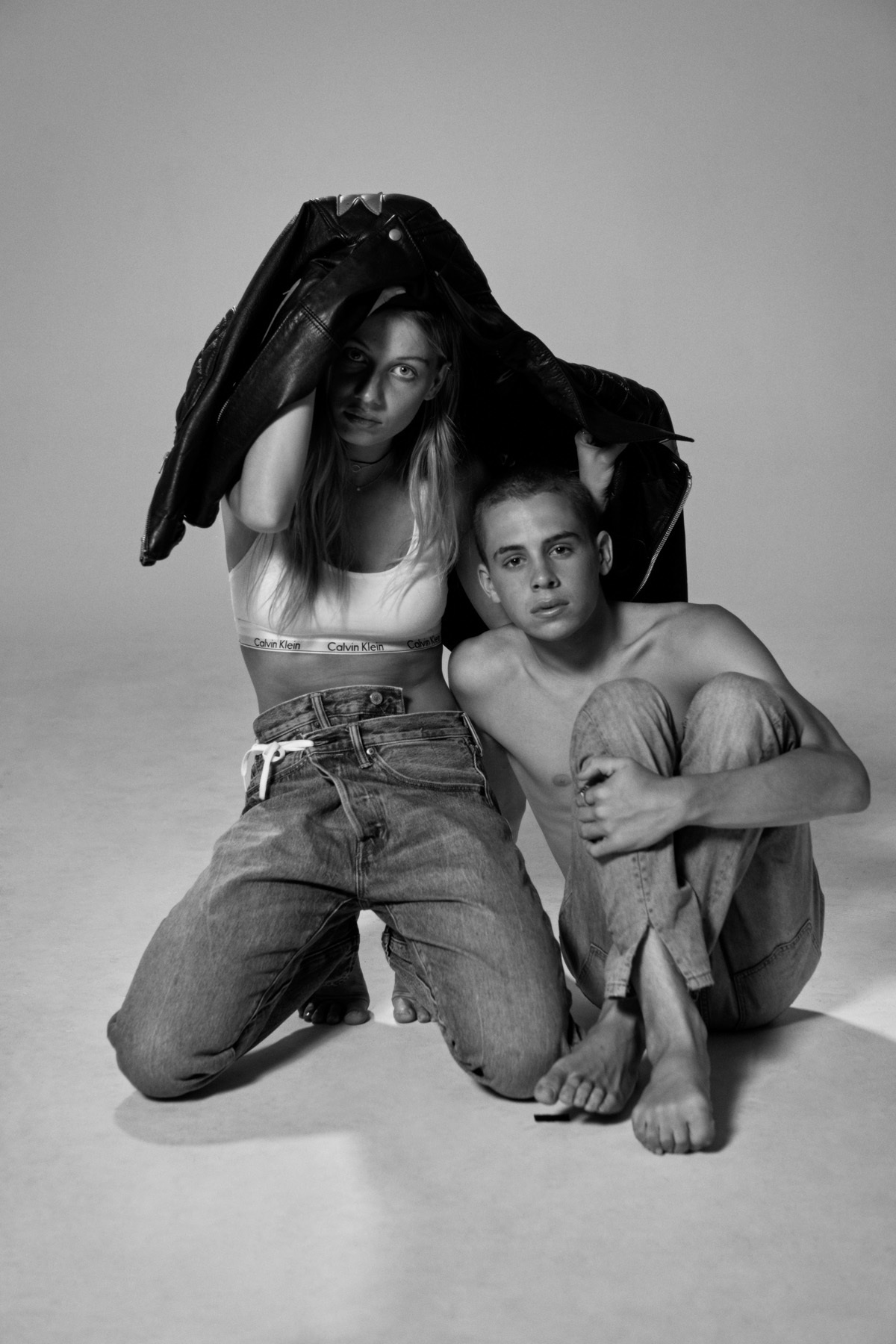 Otis wearsStylists vintage jeans, Vintage ring from Route 66.Jeet wearsCalvin Klein bra, Levis 501 jeans, Jeet's own earring.