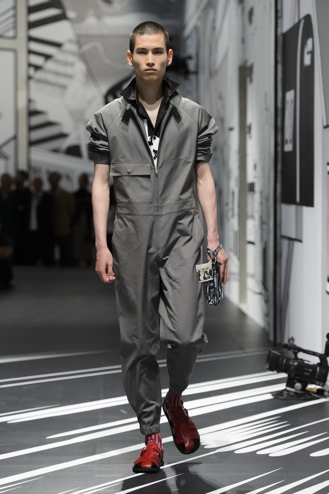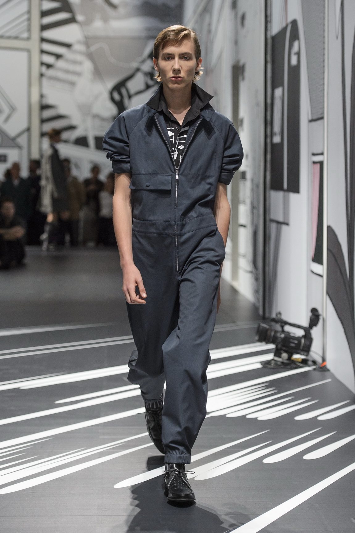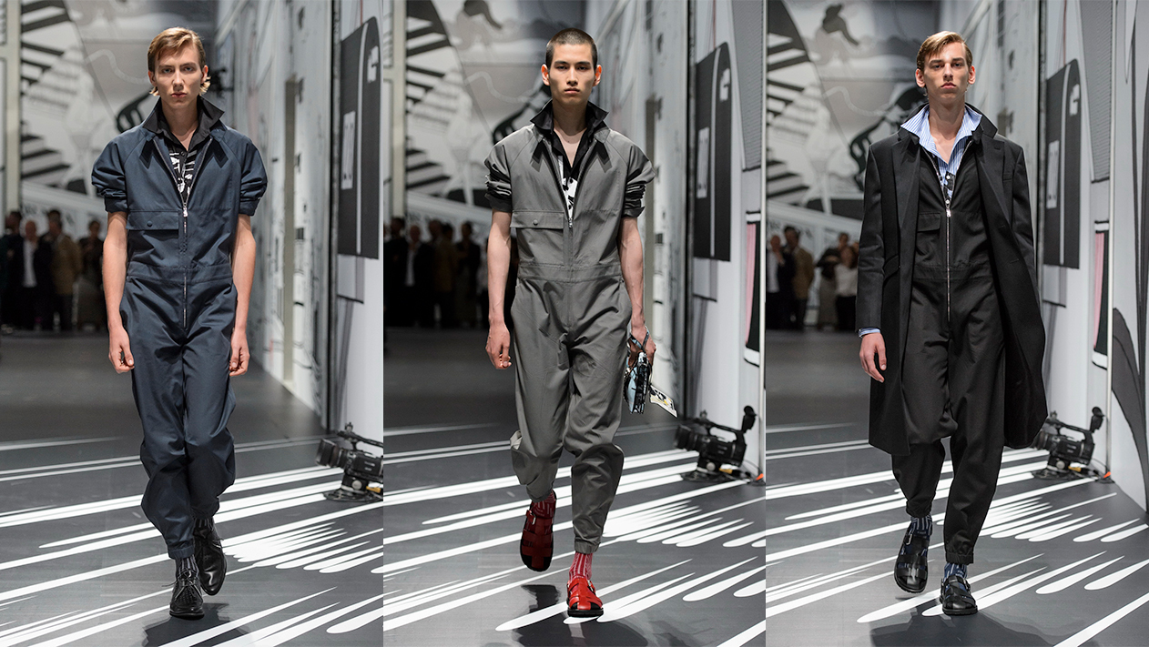 “They are my new obsession. Probably because they are simple,” Miuccia Prada mused backstage after being asked about her spring/summer 18 jumpsuits. They might be her latest obsession but it’s the second time she has turned her hand to them in a men’s collection. “I am so obsessed with jumpsuits, I can tell you the last time Prada showed jumpsuits — Spring 2008. Do you worry for me?,” Charlie Porter asked in his Financial Times show review. I’m old enough and Miuccia-magnetised enough to remember them in all their geometric glory too. The sight of their return to Prada’s latest men’s show provoked a flashback to an opinion piece Charlie wrote for the Guardian following their debut, Are you ready to jump? The jumpsuit is simple, practical and the height of fashion he proclaimed and duly declared it was time for men to get over their prejudices and, “Don the workwear that lets you live”. His argument rang true then and almost ten years on, still echoes true today.