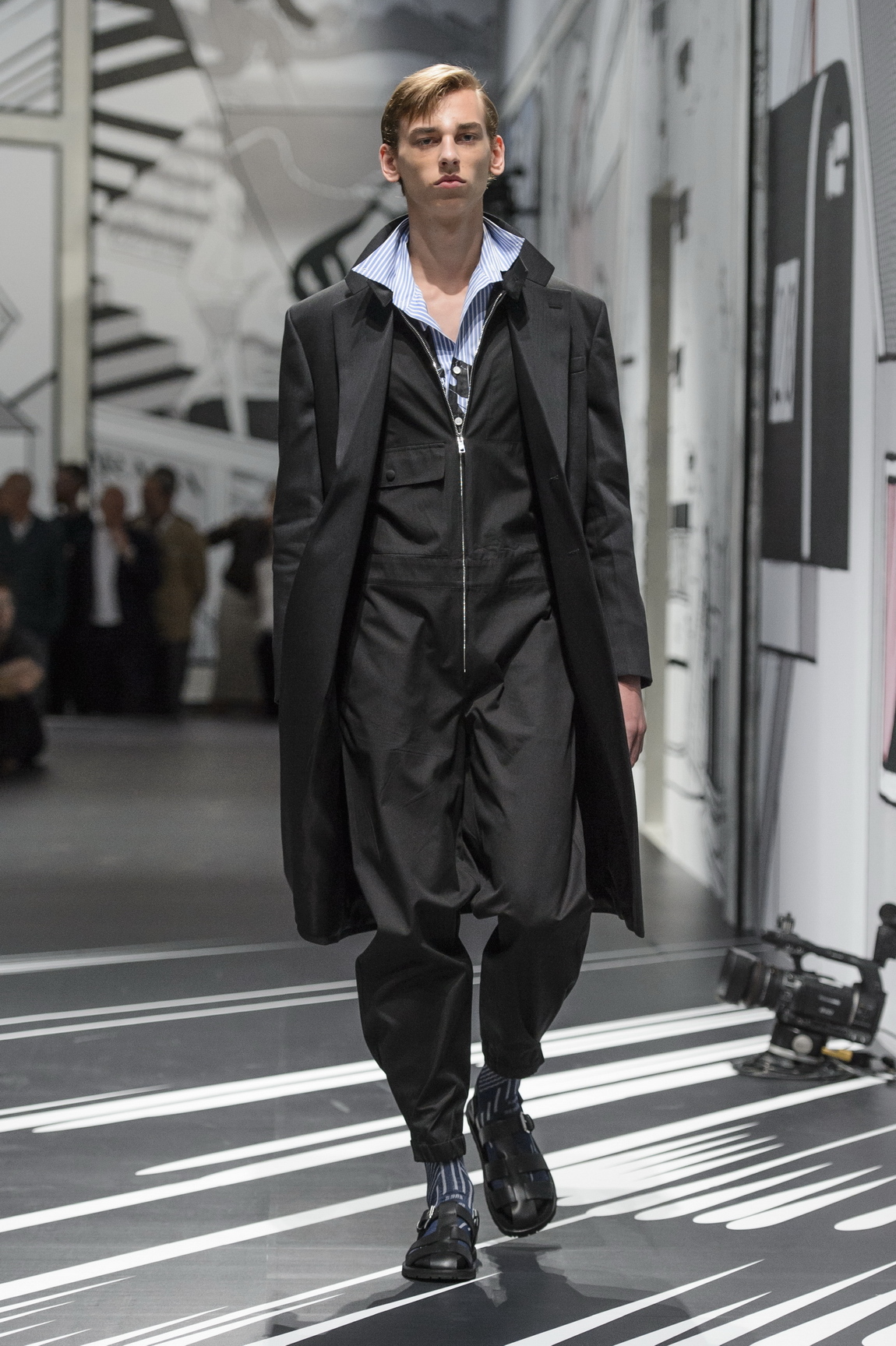 “The great thing about the Prada ones is they’re super butch — they were macho in their cut,” Charlie agrees. “There’s a slight gather at the small of the back, so they hold a shape over the shoulder and they have a check pocket which exaggerates the shape of the shoulder. Which is then exaggerated by the styling with the pushed up sleeves. When the person designing the garment has thought about creating a masculine shape, they work.” There’s no chance of you looking like a giant baby or a lost mechanic in Prada. For the brave, Miuccia offered the comic strip jumpsuit and for the curious, navy and beige versions. All styled with rolled-up sleeves because this is ready-for-action attire. For the wavering, Miuccia’s answer was to combine short-shorts and tops that achieved a romper look, but remain subtle separates. Now, the short-shorts seem to be short on the catwalks that matter this season. Everyone from Gosha Rubchinskiy and his top of thigh grazing 90s football kits to Rick Owens and his sculptural head-turners,hemlines are higher making short-shorts that bit more shocking and suggestive for spring/summer 18. As jumpsuits might not be the most provocative takeaway from the season after all, are you ready to jump? Give in to pure Prada persuasion.