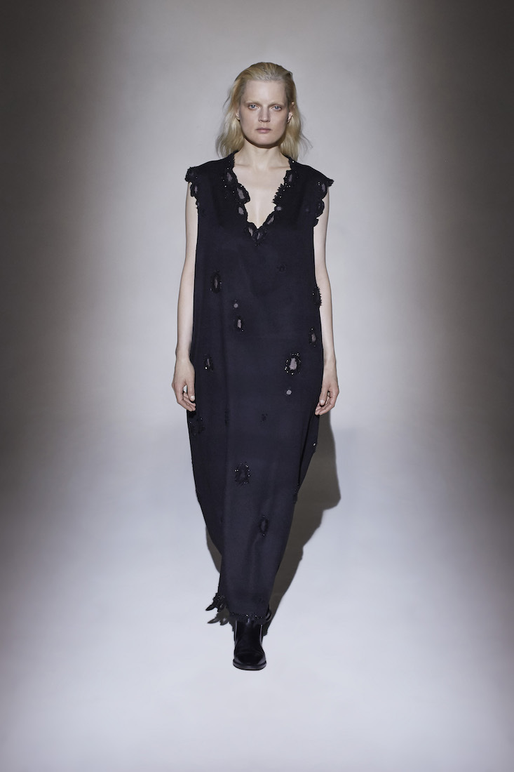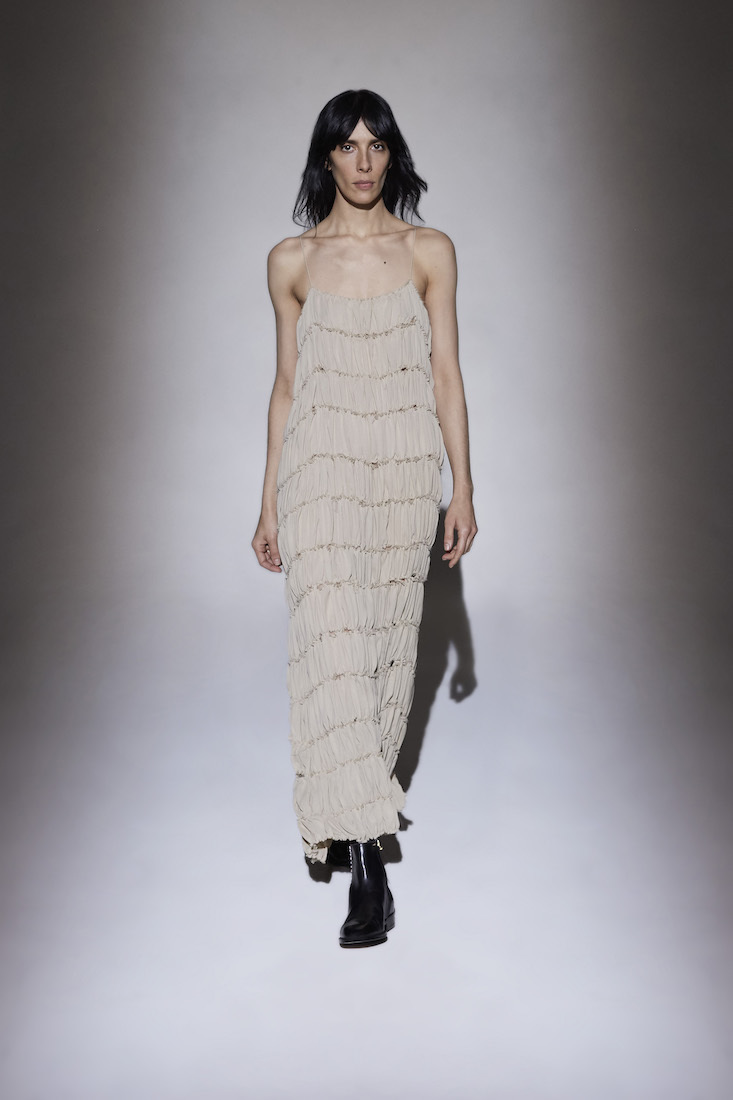 Rounding things out, polished leather ankle boots added something solid to all the airiness. Walking around the showroom after the presentation ended, you could appreciate their construction up-close. (The black ones have two rows of white stitching down the side, the brown ones have mannish loafer-style seams. Both pairs are perfect.) The designers also offered up little bow-fronted sandals and a handful of immediately covetable bags (the obvious favorite being a sort of velvet pouch tied like a handkerchief).