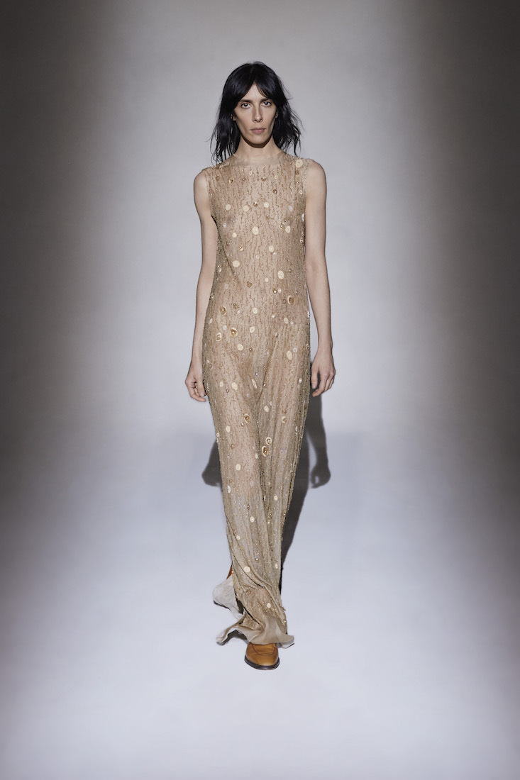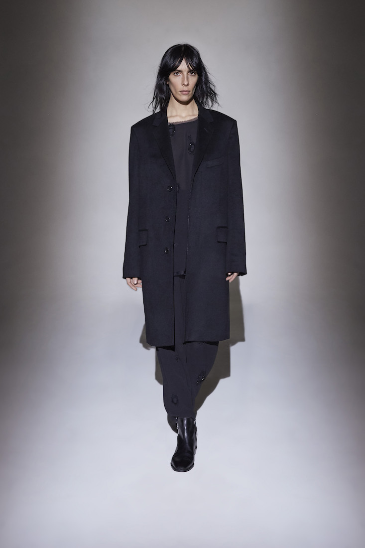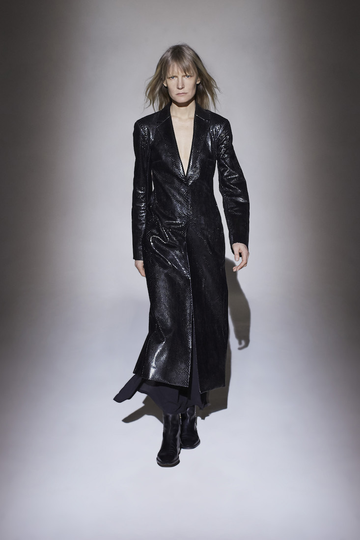Walking between mid-century furniture, a potted ficus, and leather poufs, the models wore some of the best coats seen anywhere in this snowy week of peak coat-envy. They came in a palette of mainly neutral colors and all natural fabrics, ranging from warm brown leather to supple lemony silk and insanely soft navy wool. Uniting them was a preference for an ankle-length hemline. And while the collection mostly favored loose fits and volume, a pale-pink astrakhan coat with a super-svelte tailored silhouette was a clear winner.