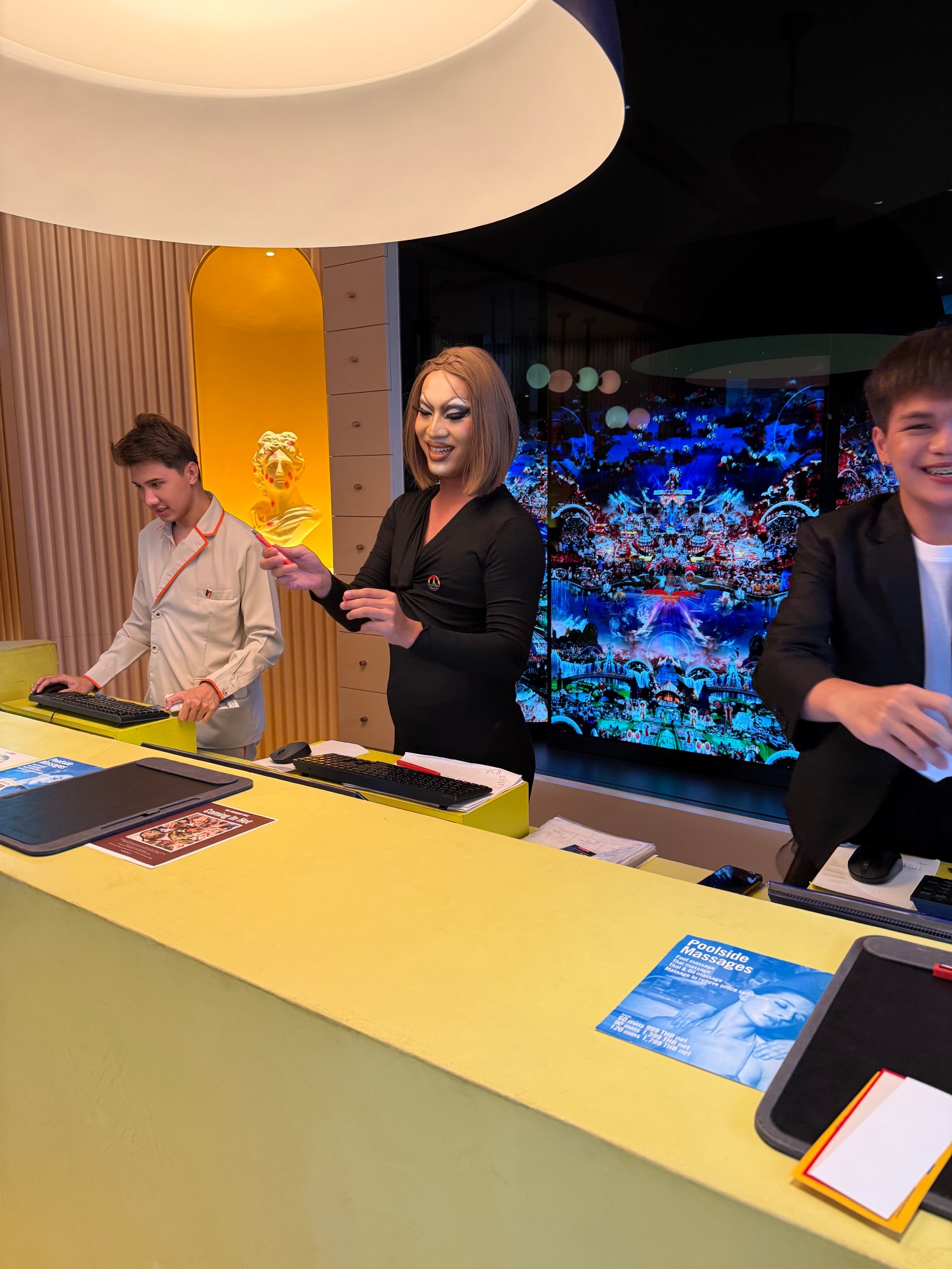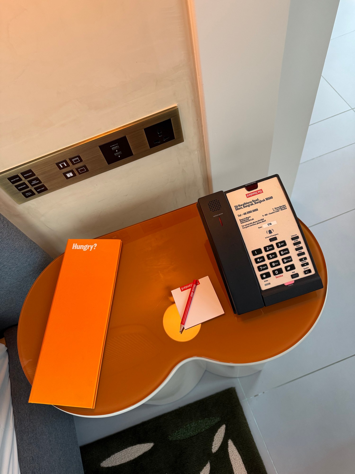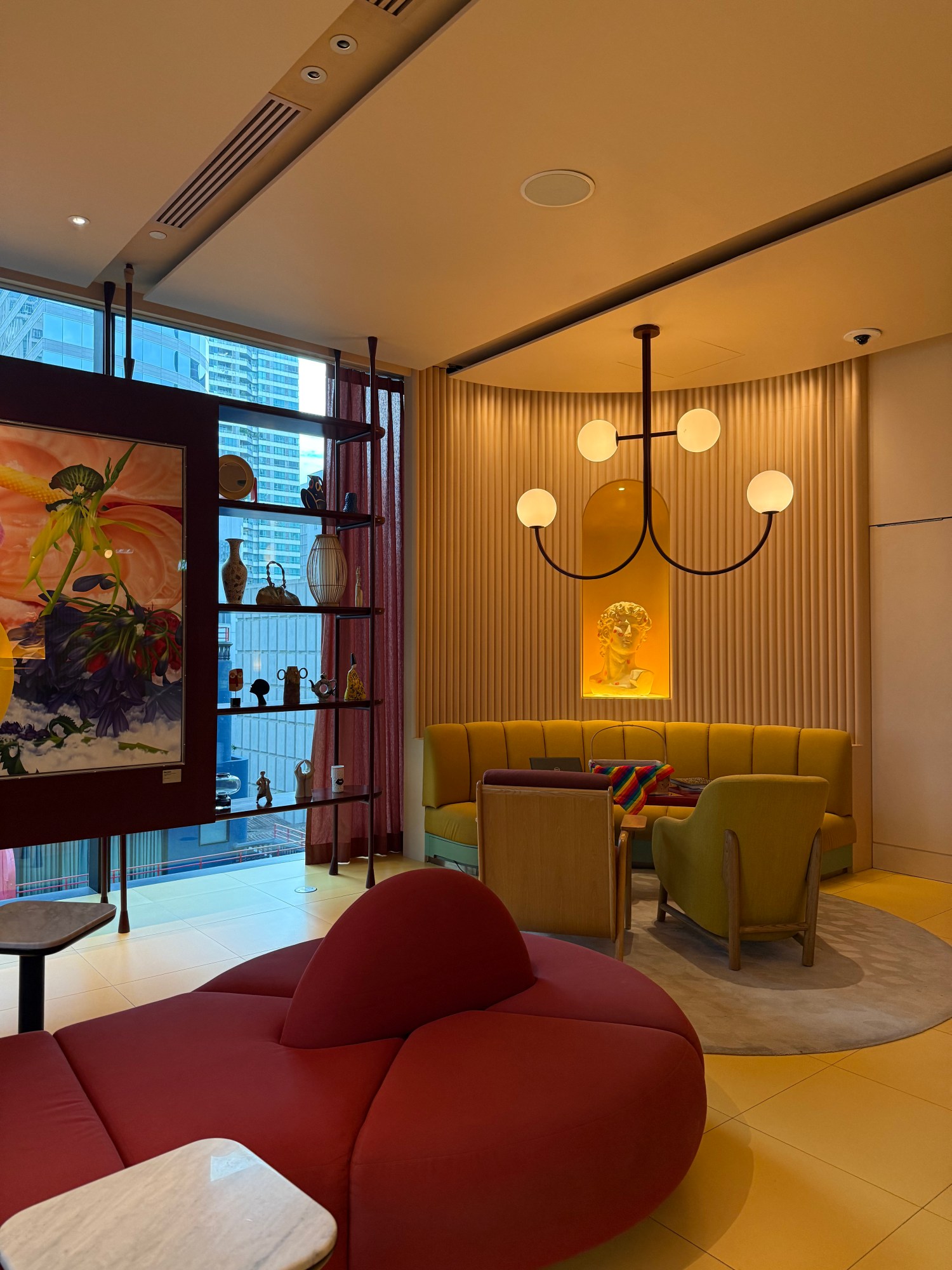 I’ve been to The Standard in London—very red, very plush, very “your therapist also DJs.” But Bangkok? She’s the fun, poppy, pastel-splashed cousin. More RuPaul, less nautical sci-fi. Less buttoned-up, more oversized shades. This place doesn’t just lean camp—it does the death drop. Check-in happens on the fifth floor. I glided out of the elevator into a lobby that felt like the living room of someone who definitely owns an Ettore Sottsass lamp. The art was playful without trying too hard and the air smelled faintly of citrus and good decisions.