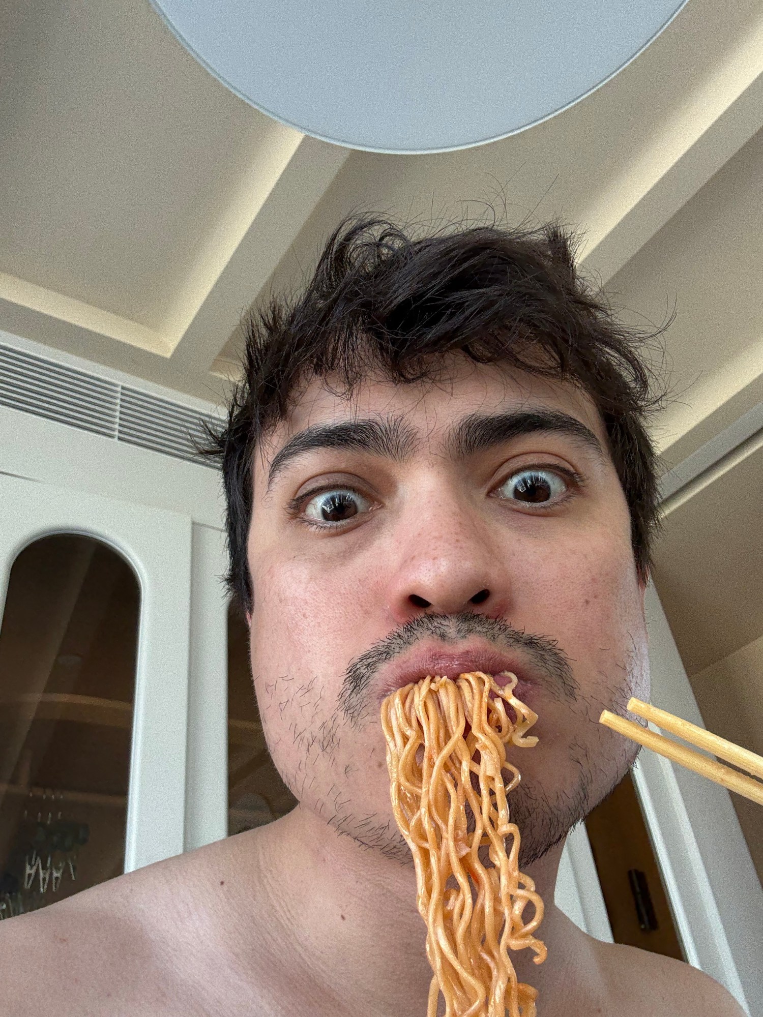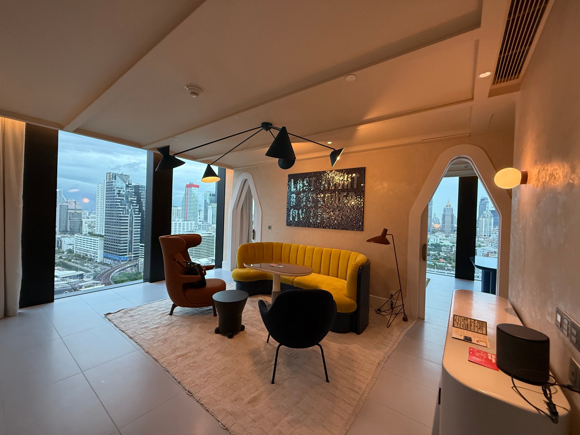Then came the elevator ride to the 17th floor. Ears popped. Anticipation built. And then: my suite. Not a room—a suite. With panoramic views of Bangkok’s skyline, a curved yellow sofa that looked like a sentient banana, and a welcome spread so generous I felt seduced. Macarons, pastries, fruit, a bottle of Pinot Grigio all to myself. Reader, I got lit and began my grand tour.