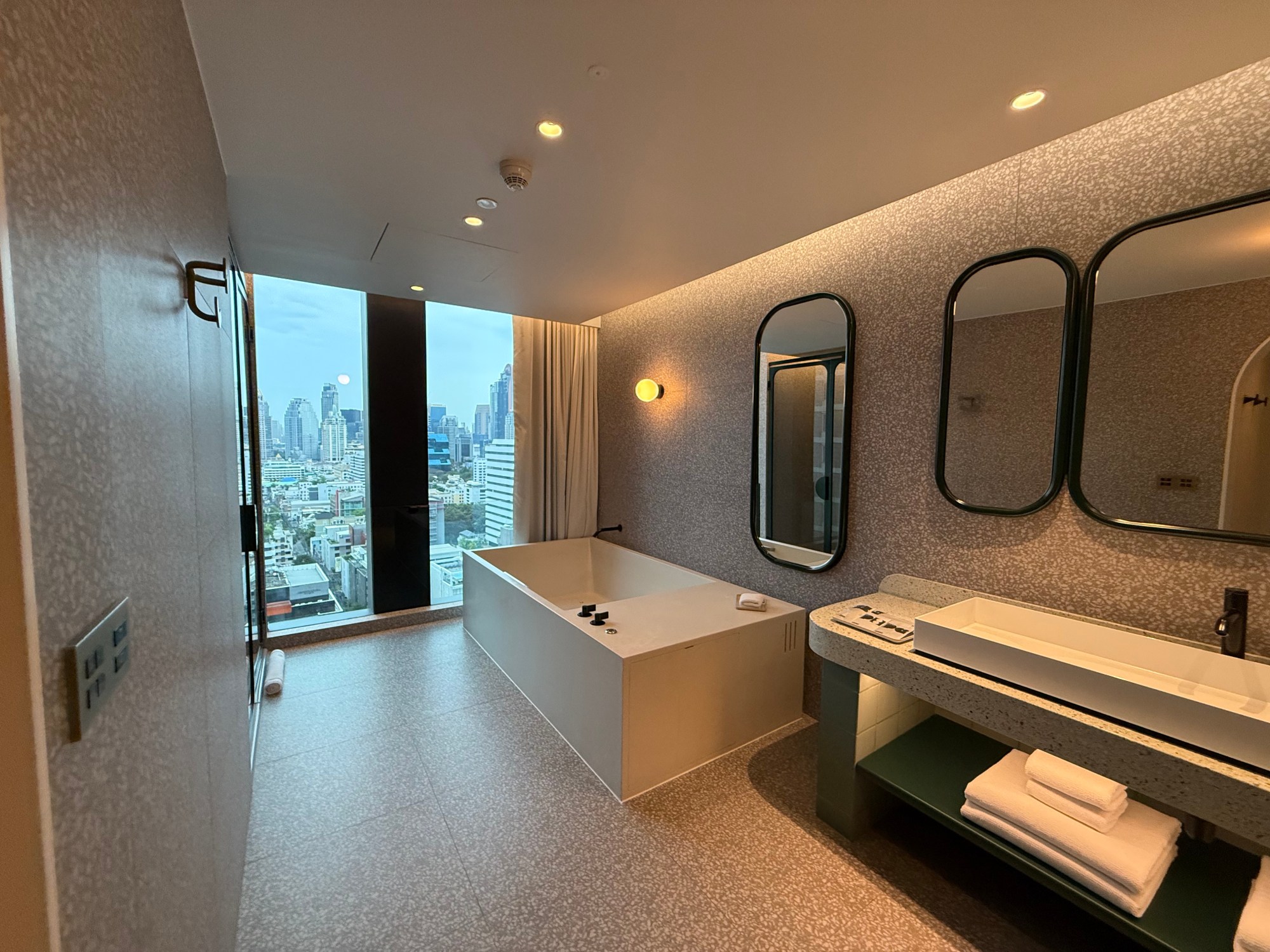The bedroom leaned maximalist in a very chic way. Primary colors, a king-sized bed with cloud energy, a floating TV, and a glowing wardrobe that made me feel like I was prepping for Fashion Week. The bathroom? Massive. Grey with forest green accents. A square tub the size of a Bangkok condo. Jets that could launch a small boat. I climbed in with a glass of wine and contemplated my entire life. And yes, there was a separate, equally stunning shower for when I wanted to feel practical.
