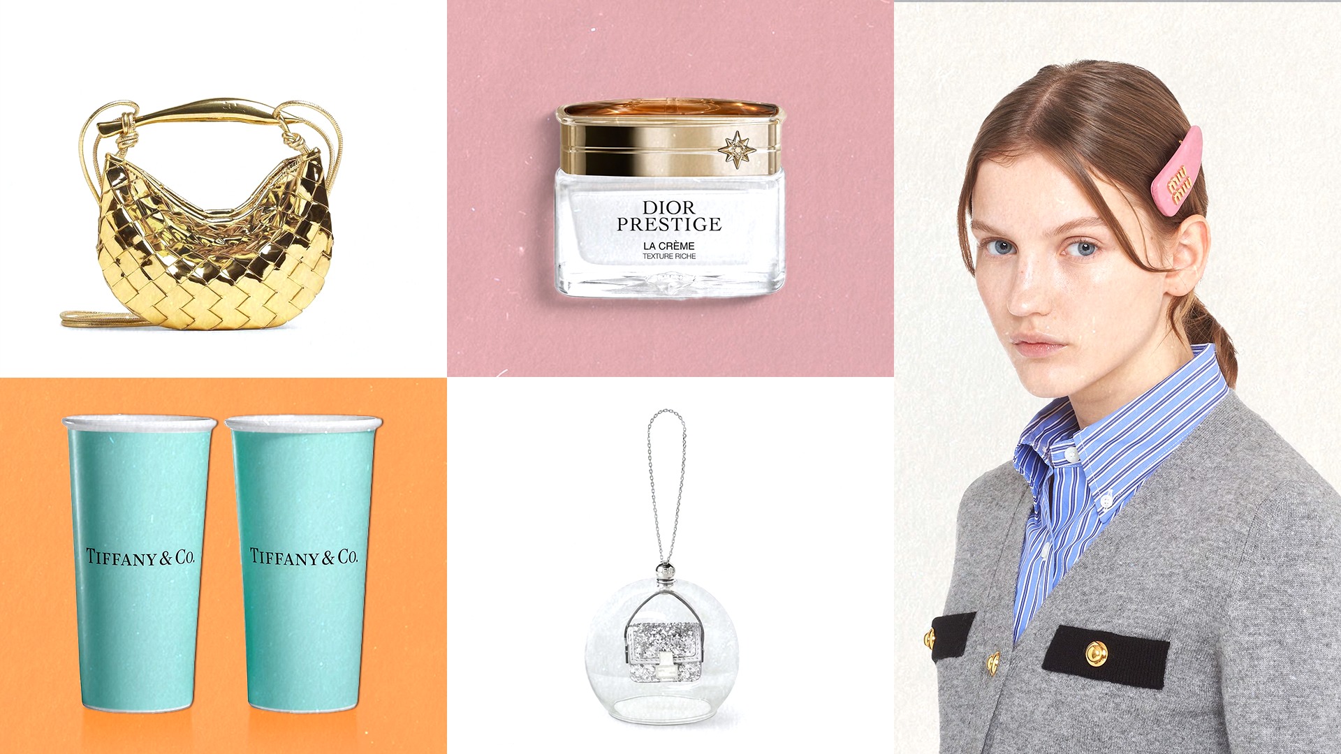 collage of tiffany, dior, bottega and miu miu items for christmas