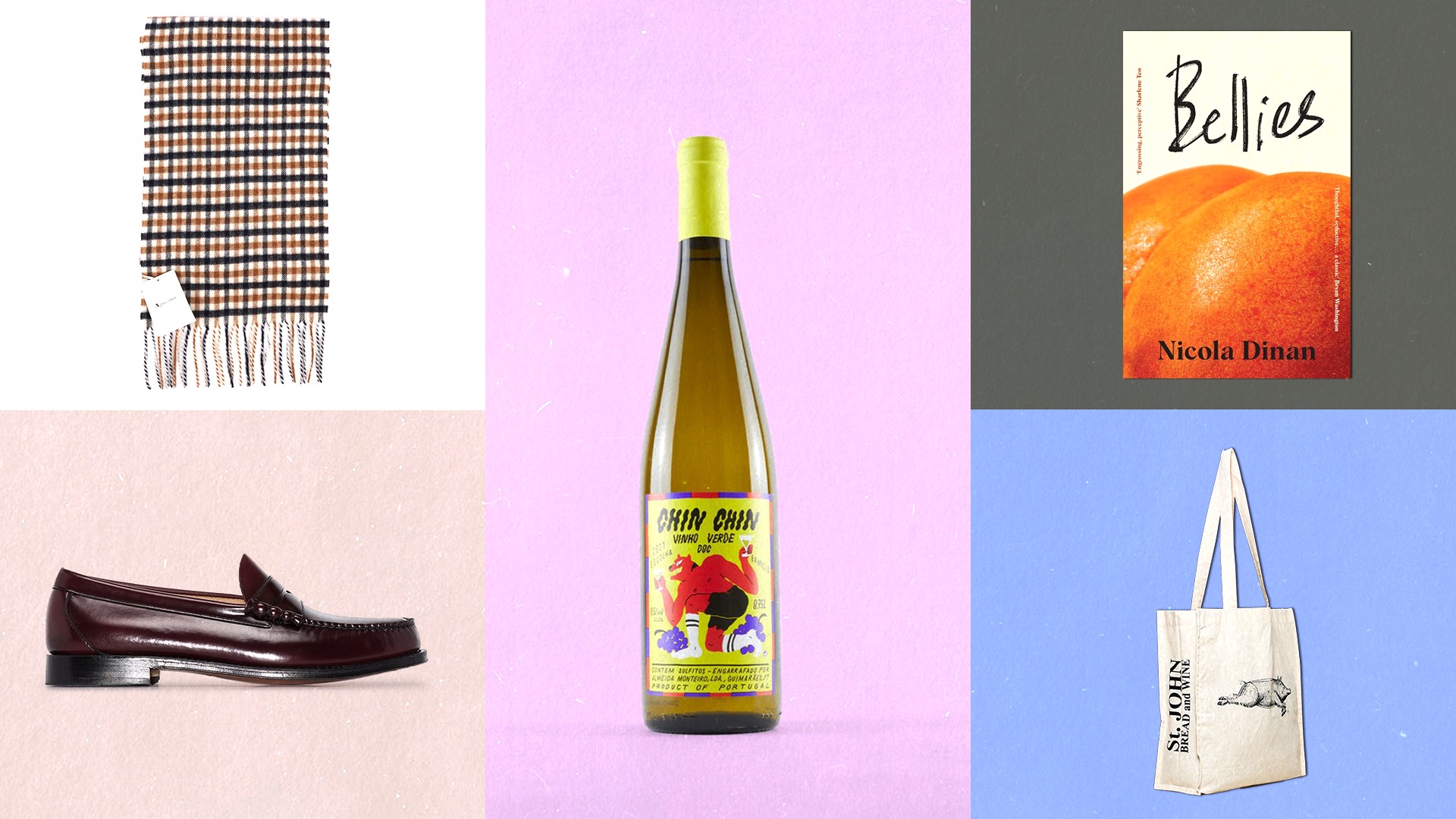 coloured collage of scarf, loafers, tote bag, book and natural wine