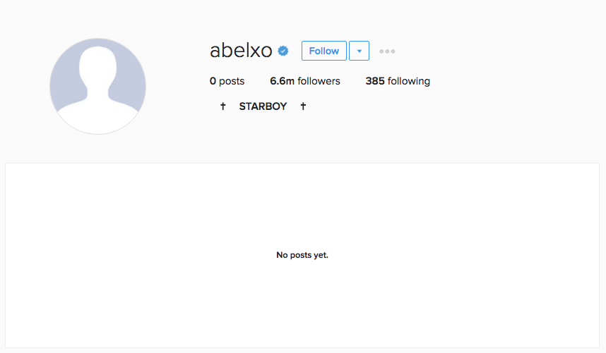 Normally your fave deleting all their Instagram photos is not a cause to celebrate, unless your fave is Abel Tesfaye. While the media-shy artist known as The Weeknd has never been the most prolific Instagrammer, he is one of the most cunning, in the past using the platform to tease new album drops not by posting a photo but by deleting literally everything from his page. This is why The Weeknd’s 6.6 million Instagram followers are not reacting to his disappearing act in quite the same way that Beliebers did when their idol deleted his account last month.