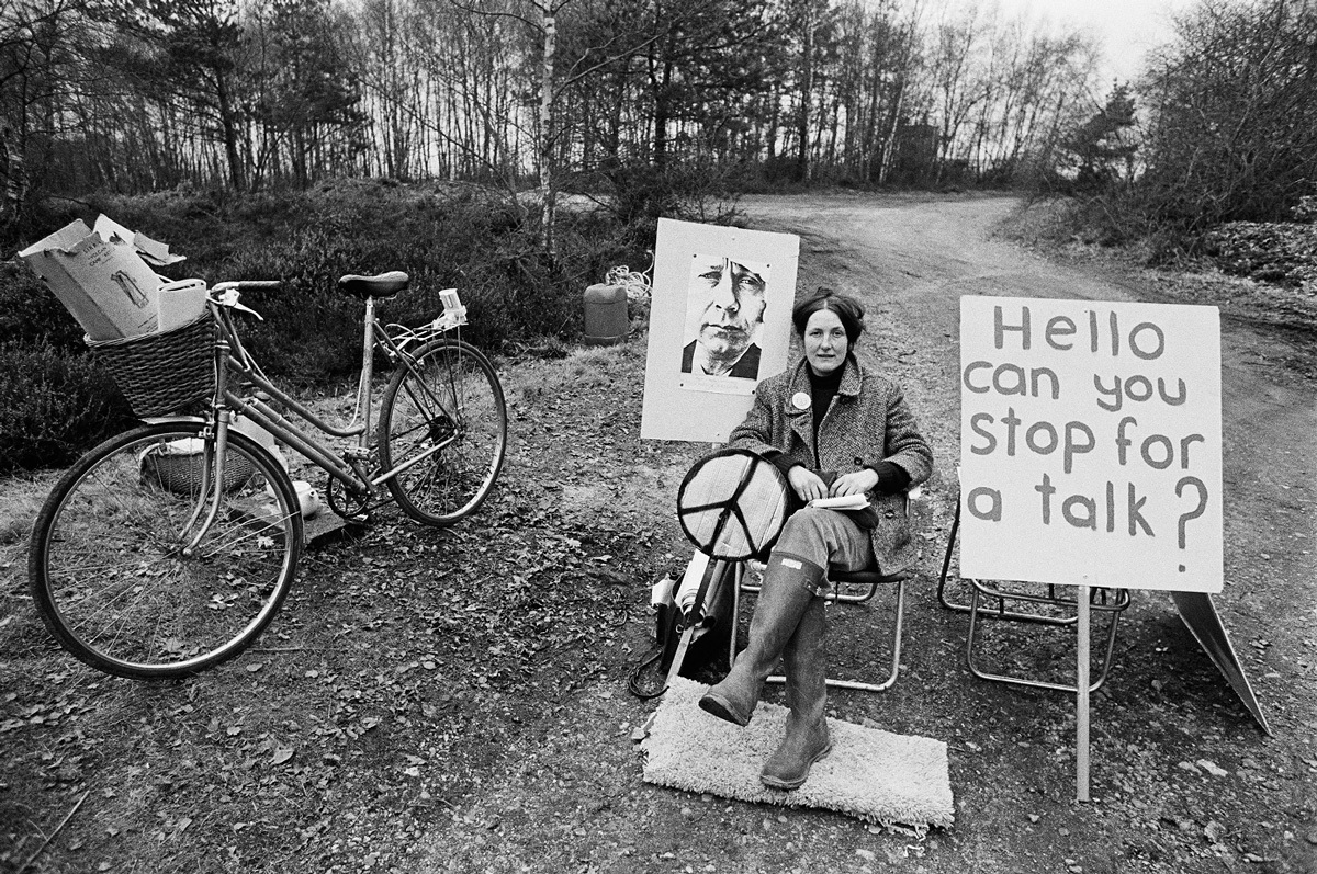 Yes, I think you’re absolutely right. The humor is there. Of course, apart from the fact that the British have a wonderful sense of humor anyway, there was a tactical element to it, because humor is a wonderful way of attracting attention and making something stand out. So there was an intentional element to that humor. But even so, the sheer creativity of it and the individuality of it. And so much of it is, in fact, incredible polite. There’s a wonderful image of lady sitting in a chair, picketing the entrance to Greenham Common, and her sign reads, “Could you stop for a chat?”