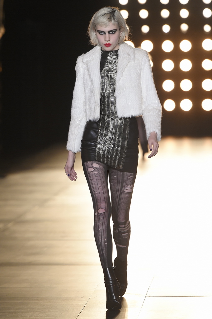 Over at Camp Hedi, the girl was just as young, if not younger, but rather than bat her eyelashes at him, this Saint Laurent sweet sixteener would probably get him drunk and steal his car. There was a young Courtney Love vibe about the collection, shown on an elevated runway. Kinderwhore, they called this look in the 90s. Siouxsie Sioux, they called it in the 80s. A girl in heavy black make-up and a tulle-y pink prom dress opened the show and set the mood for a collection that only got tougher in a slightly twisted way that prevented things from getting too elegant and Parisian, the latter’s music scene being the current obsession of Hedi Slimane.