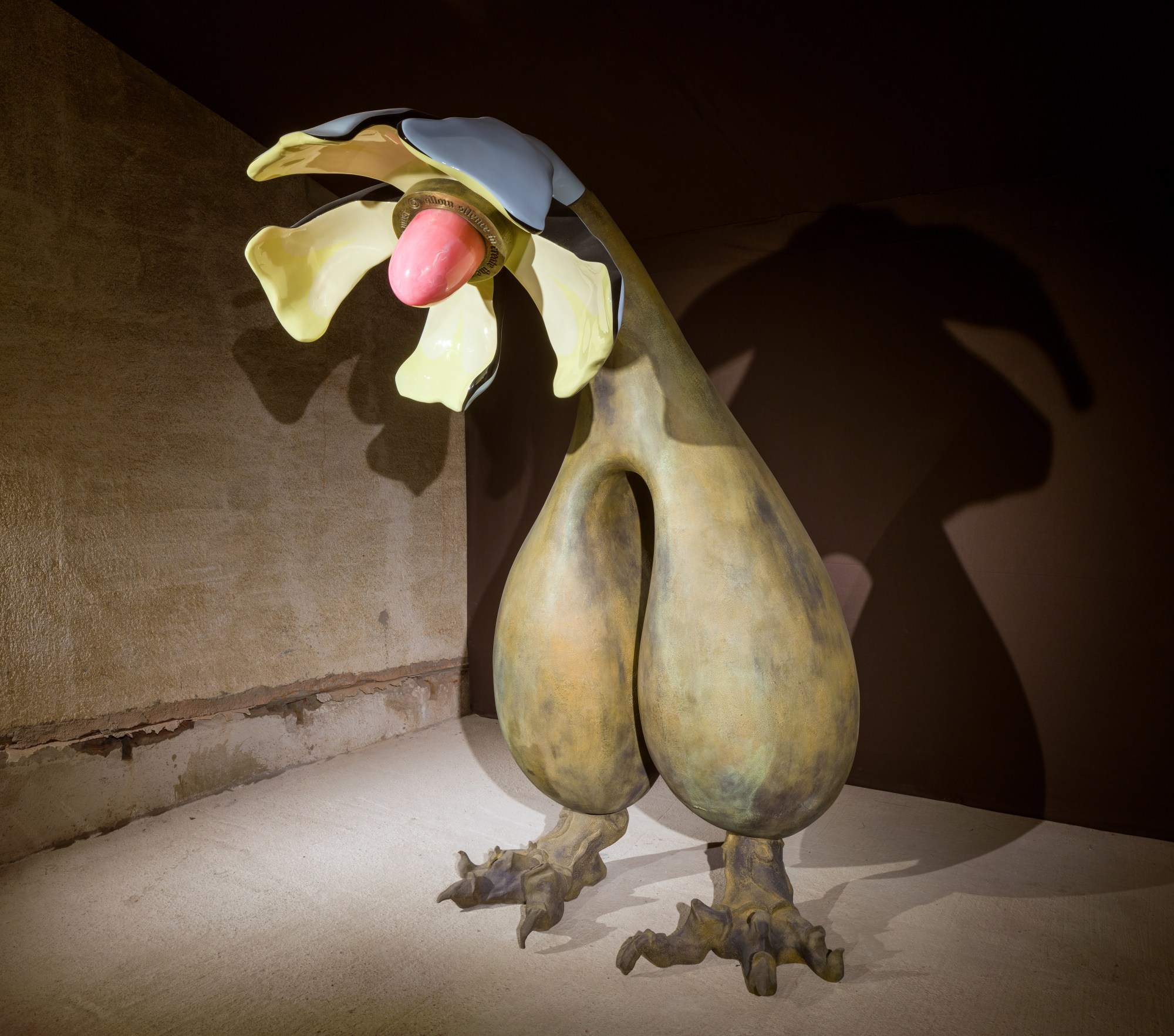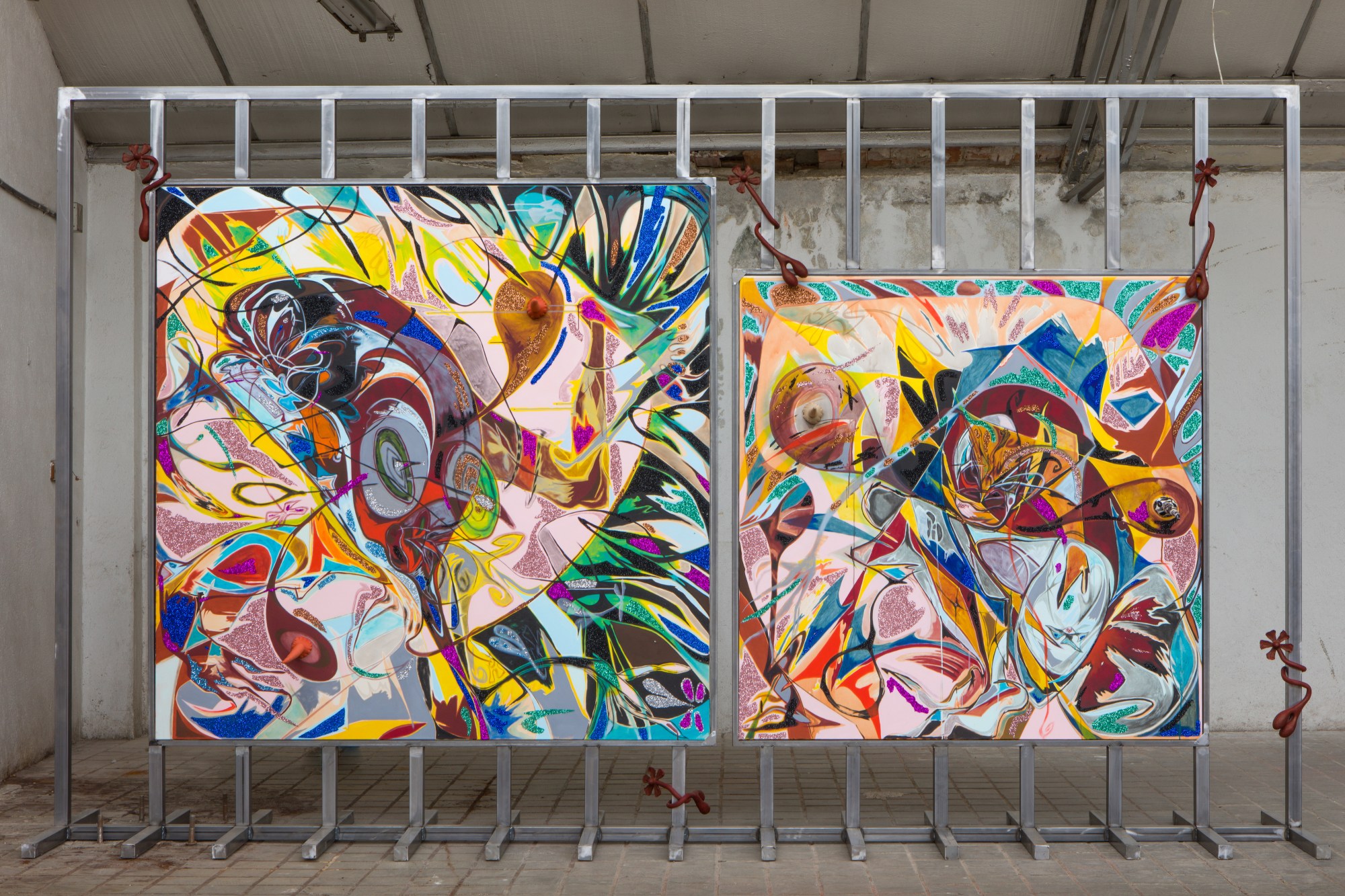 The Veta show saw her realise the “scrotum flowers” that she has been experimenting with for years as a nine-foot, 800-pound bronze sculpture. Others live wrapped around metal structures mounting the paintings. “The scrotum flower, to me, is that embodied pure balance of energy. The head is a flower, and the bottom portion is a scrotum. It’s not necessarily about sexuality. It’s just about two different icons to represent the union of masculine and feminine energy.”