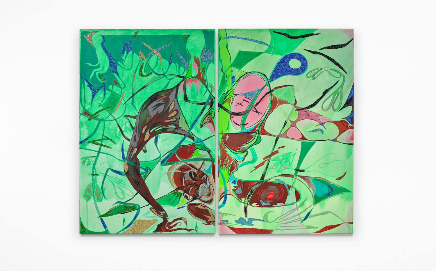 That tension between uncertainty and movement is legible on the canvas, in both the exhibition at Veta and new works on view at Beyond Identity, a group show at Jessica Silverman in San Francisco, which opened on 23 July. Since her debut show, BBW, in 2016, Theresa’s focus has shifted from a small community of bodacious, often-masked Black femmes realised boldly in graphic psychedelic shapes, to forms that grew increasingly more abstract, steadily taking form as swirling, sometimes disembodied arms, legs, noses, and eyes. Now, in her most recent works, Theresa is focused on a more singular, if fragmented, being, whose movement mirrors her own inner spirit.