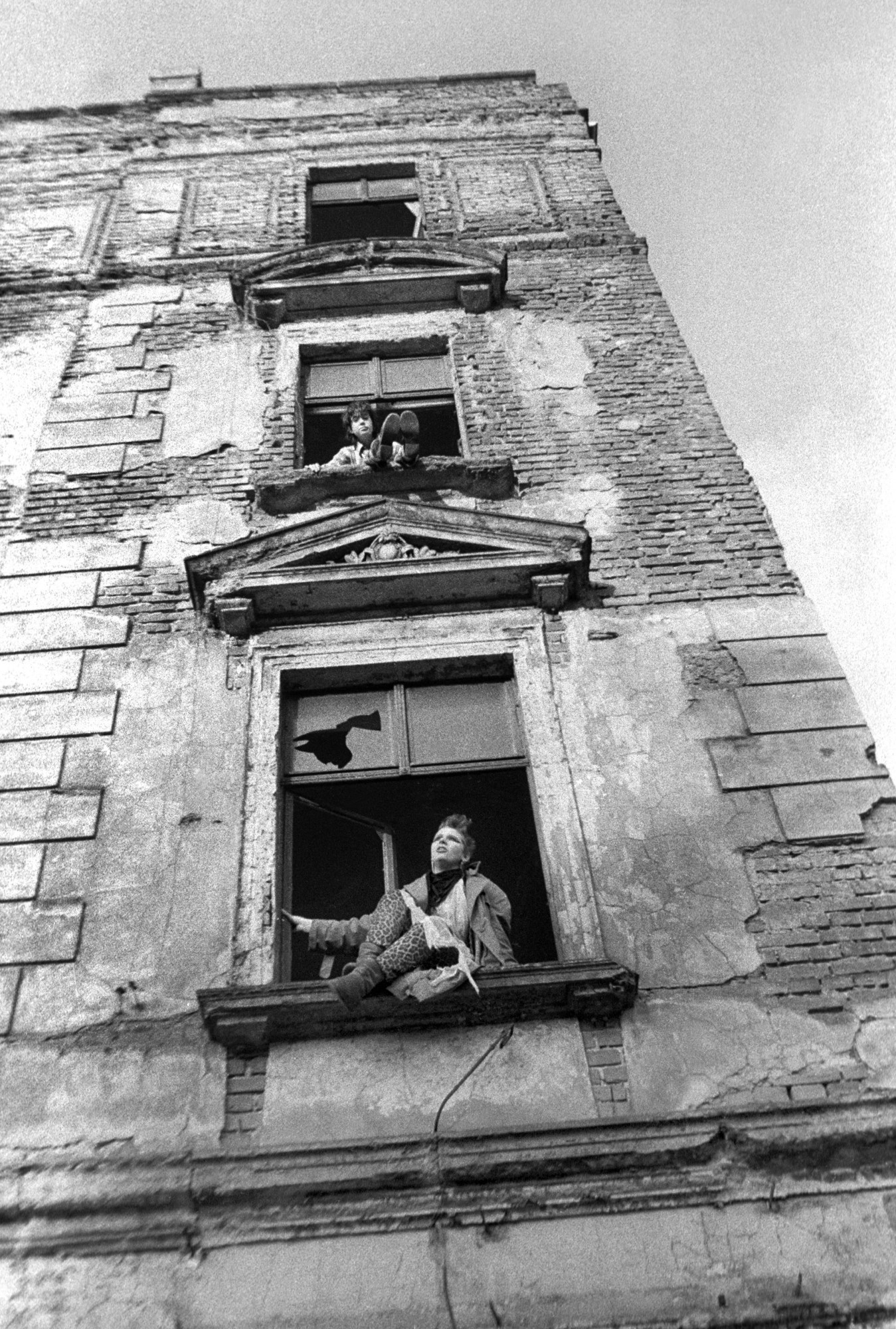 Eisler too studied photography at the Hochschule für Grafik und Buchkunst in Leipzig (1978-1983) and pursued a documentary approach, notably a series about the Jugendwerkhof correctional center for adolescents in the GDR. She photographed her friends frolicking through the blown-out city as if it were a post-apocalyptic playground. Her work on punks in Leipzig and Berlin—she described them as her “protagonists”—was a source of both creative thrills and real danger. Punk communities had disparate constellations spread in various parts of East Germany, often connected to the music scene. Punks were systematically harassed and repressed by the Stasi (the State Security Service), and the communities shrunk as figures tried to leave the East. Eisler was proud of mixing with these “unpredictable, raging young people who challenged the regime and let me hang out with them,” she wrote in 2017. But her photographs also made her a target of suspicion and political intimidation. She and her friends would be searched while on the way to a concert or a party, and psychologically or physically threatened by authorities. Her final graduation project, which she submitted to the school, was locked away by the Stasi as though “toxic.” In 2016, the very same series on punks that had been censored by GDR authorities was published in book form and exhibited at the Stasi archives in Leipzig.