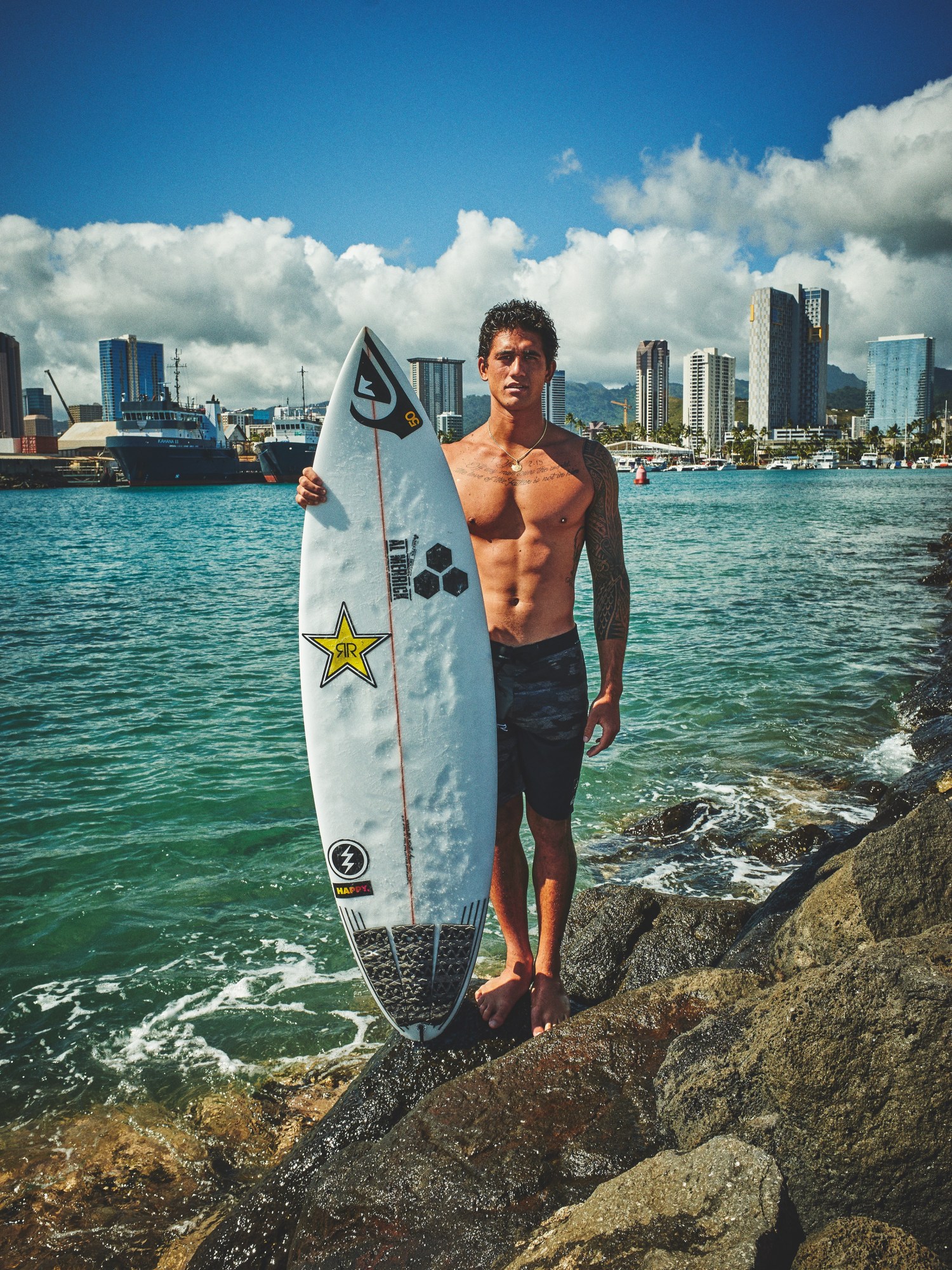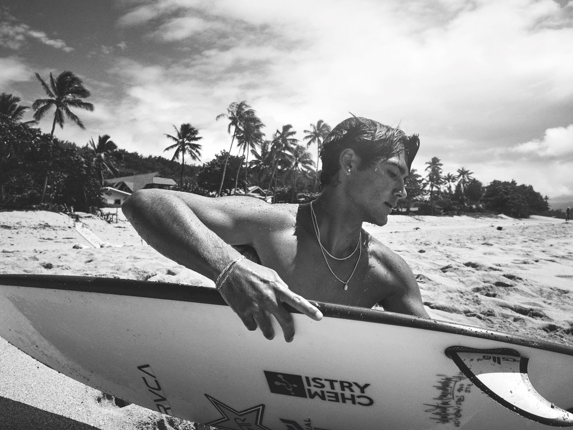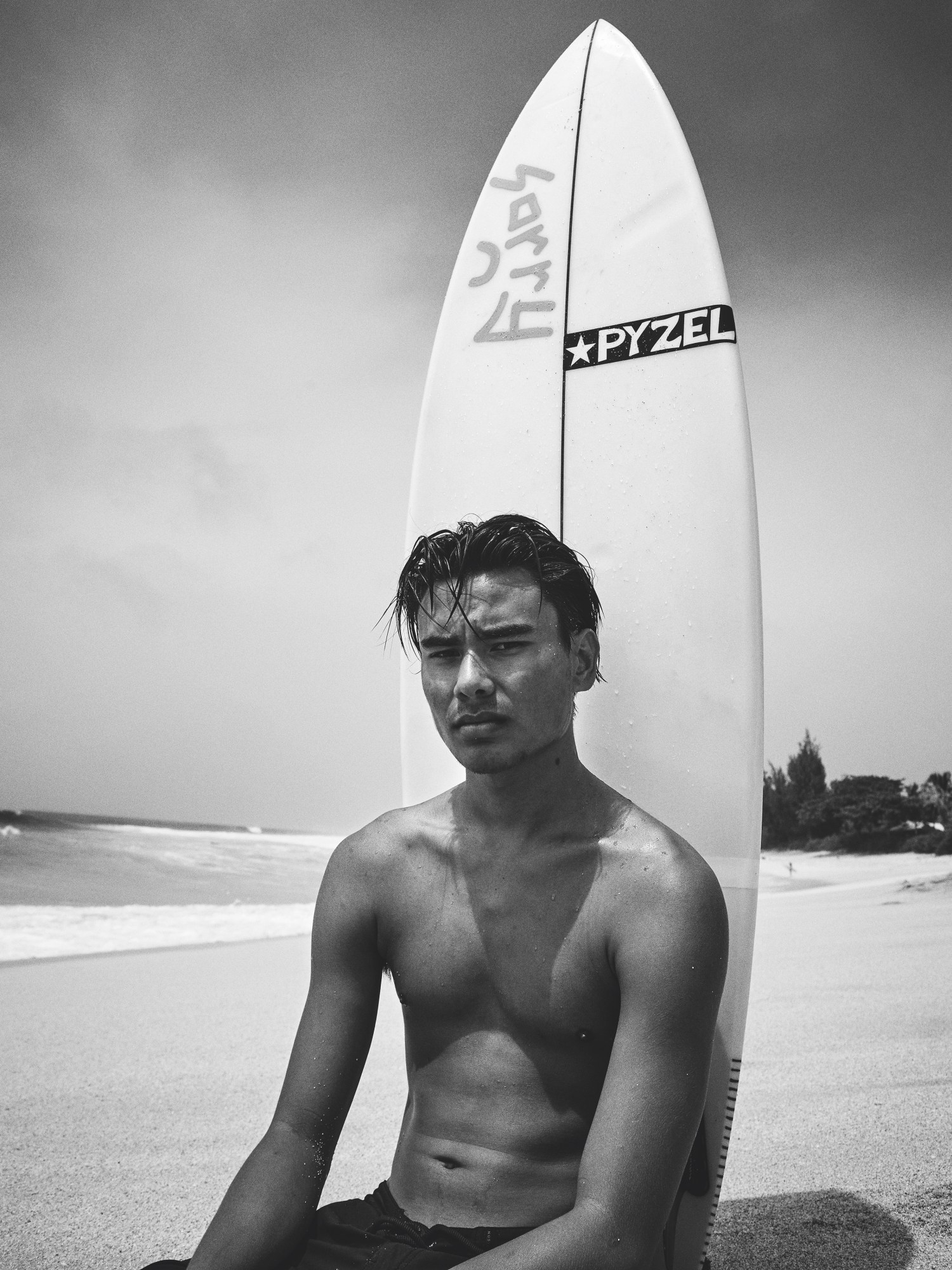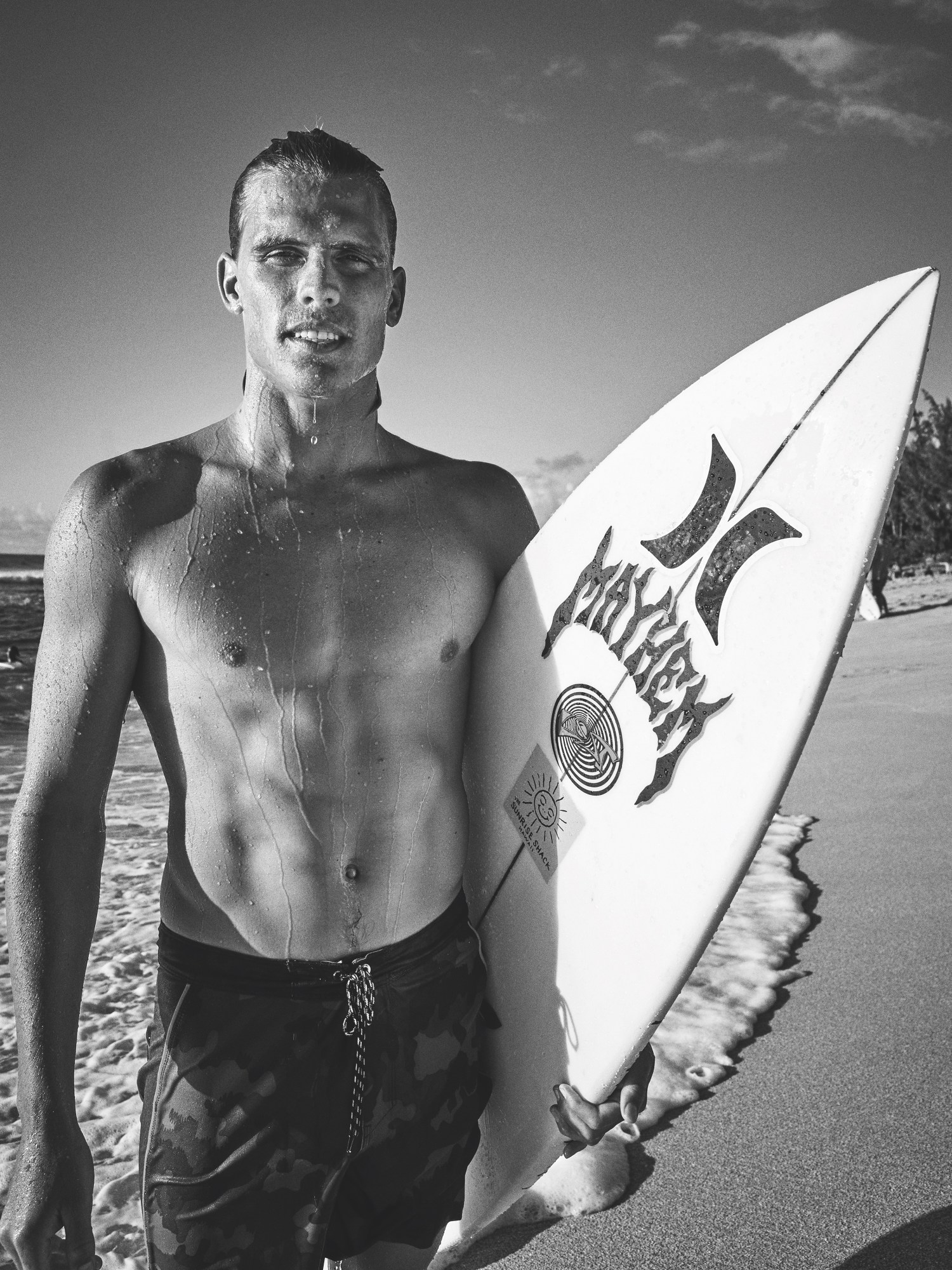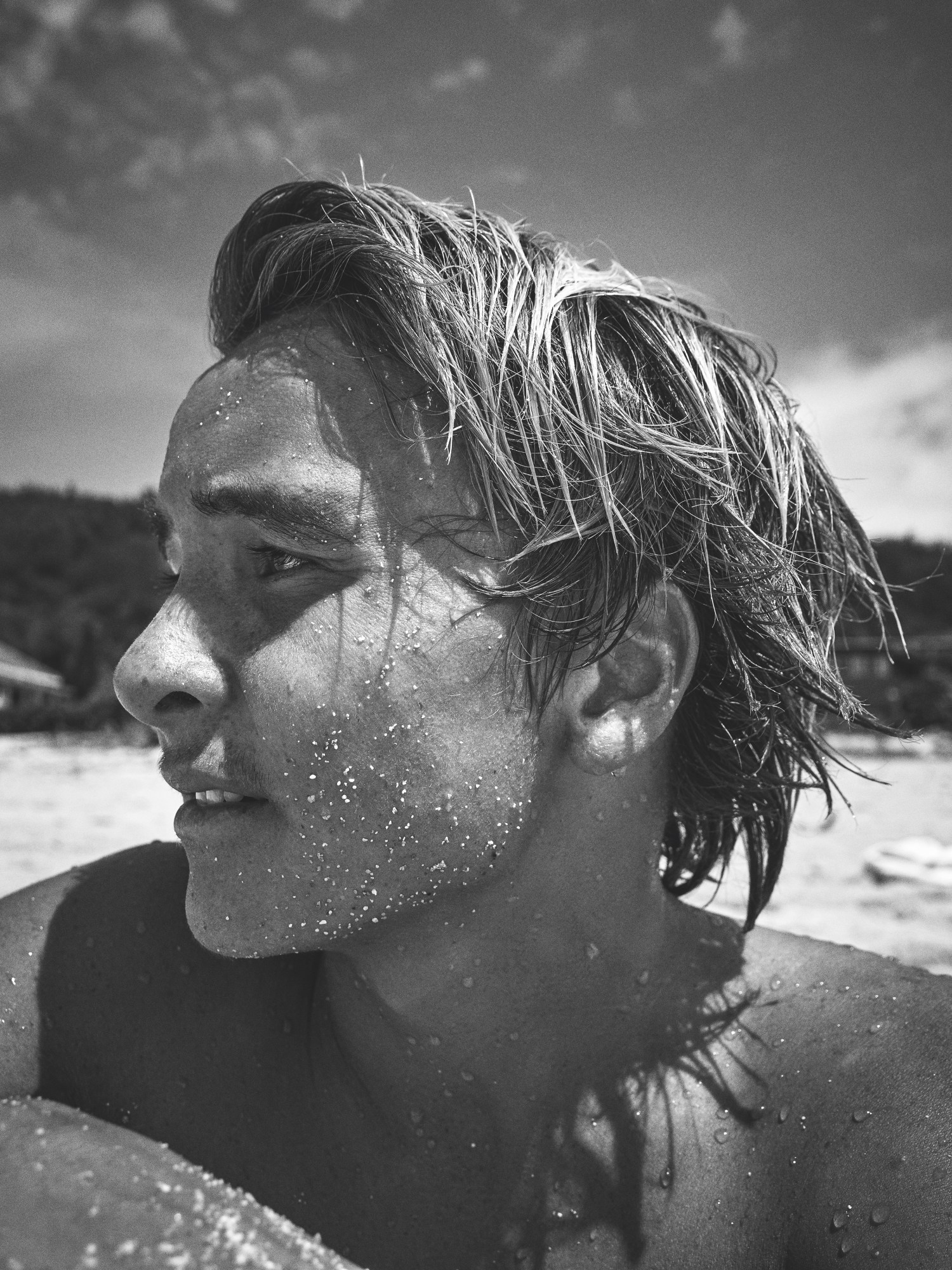 “There is something timeless about the idea of coming out of the water,” Gray Sorrenti says. “Timelessness is something that I feel right now. That feeling of being in the water for one hour always feels like three. Timeless to the point that the tips of your hair start to change colour or your eyes become lighter from the sun and your skin becomes slightly darker. Once you paddle and get up and catch a wave, all of that is swept away. There is nothing left between you and the ocean. Now you’re on the shore, but there’s still a part of you that’s in the water.”